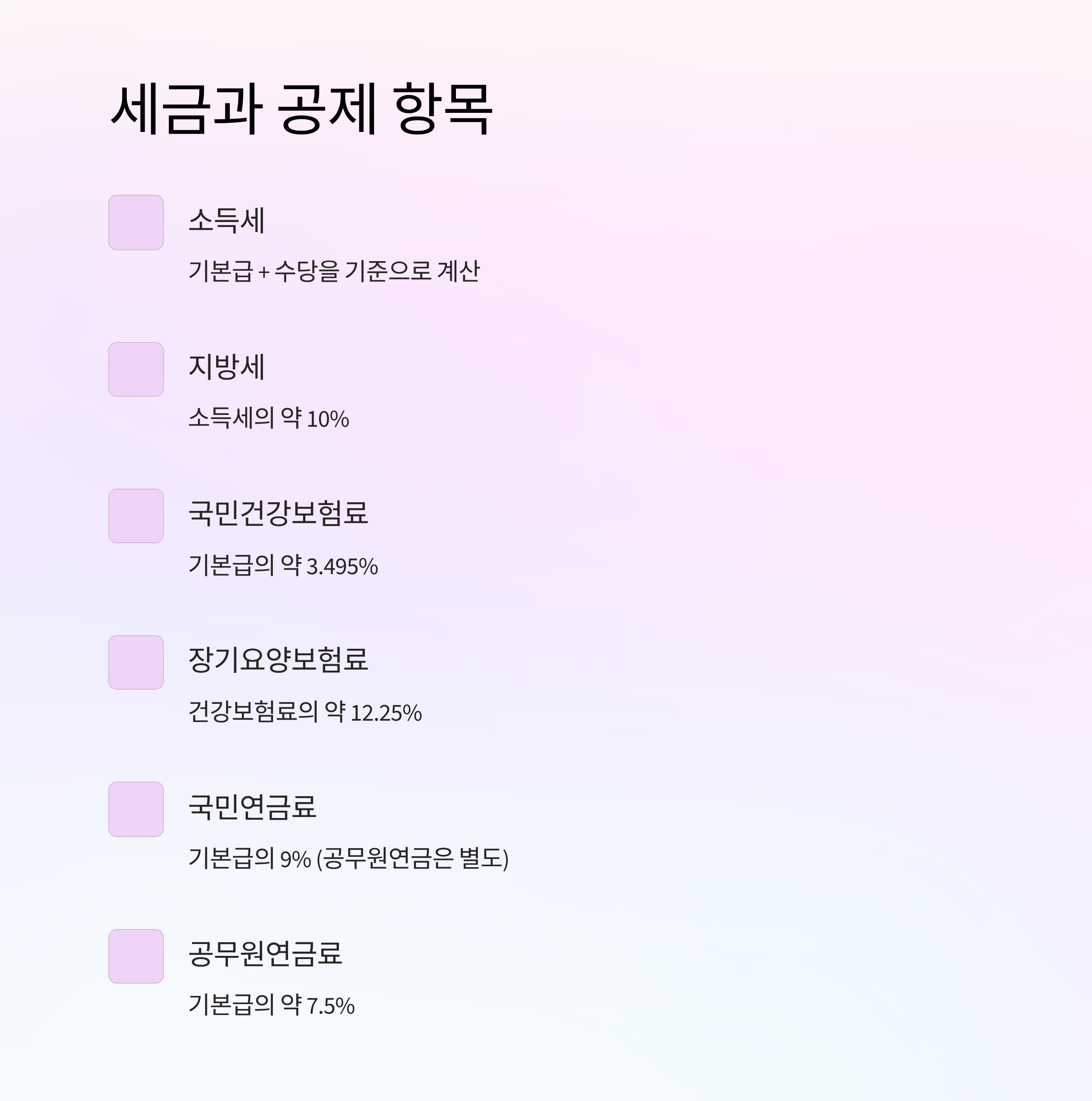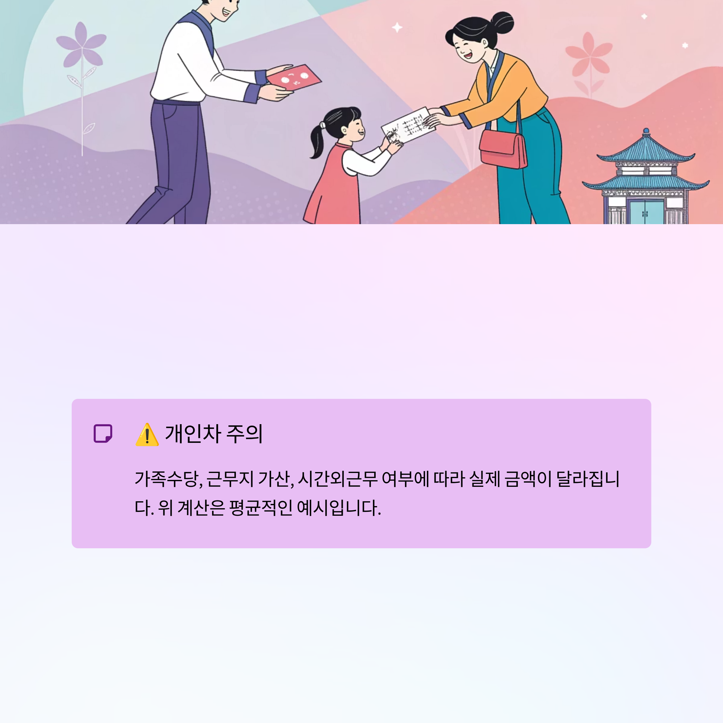 ⚠️ 개인차: 가족수당, 근무지 가산, 시간외근무 여부에 따라 실제 금액이 달라집니다.