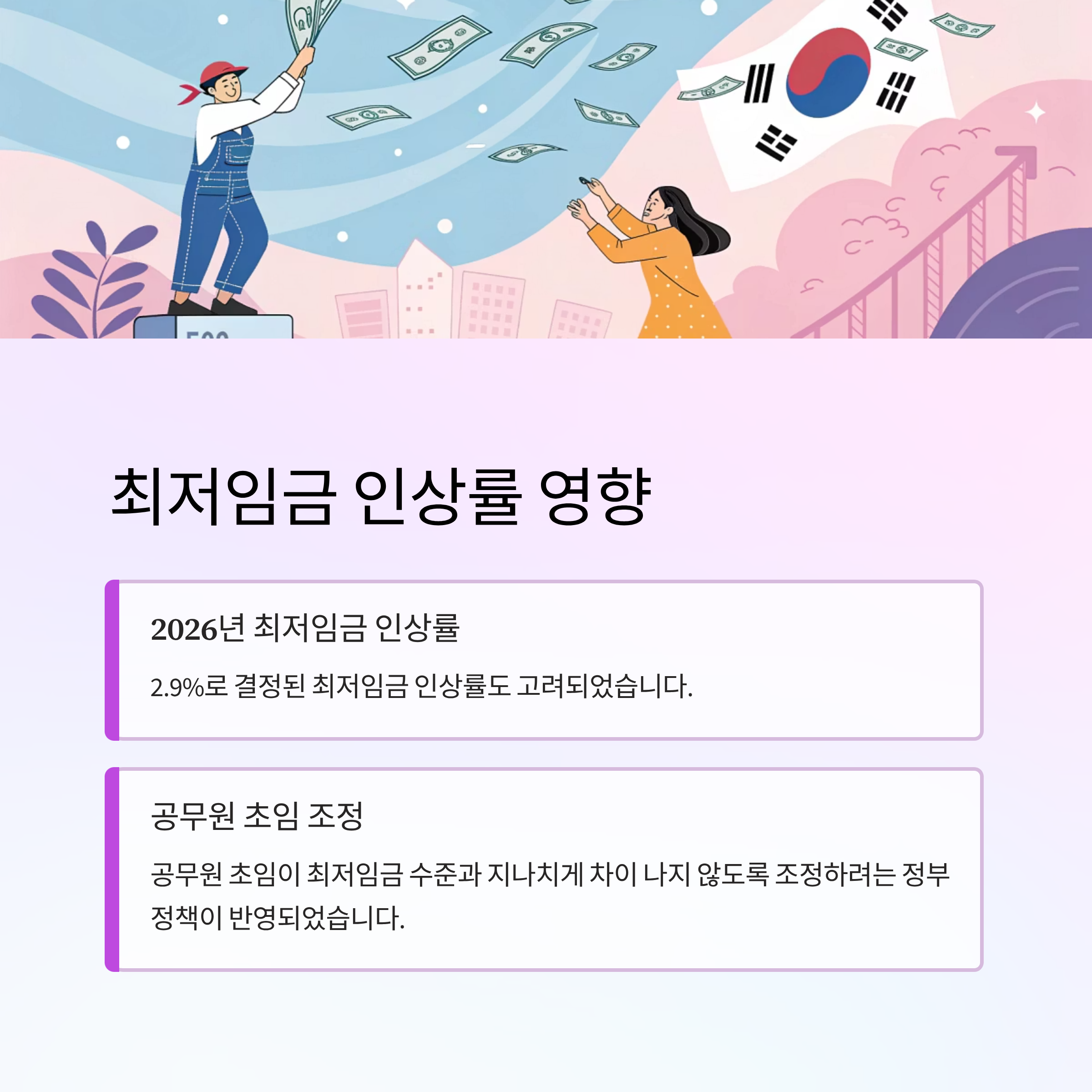 2026년 최저임금 인상률이 2.9%로 결정된 것도 고려되었습니다. 공무원 초임이 최저임금 수준과 지나치게 차이 나지 않도록 조정하려는 정부 정책이 반영된 것입니다.