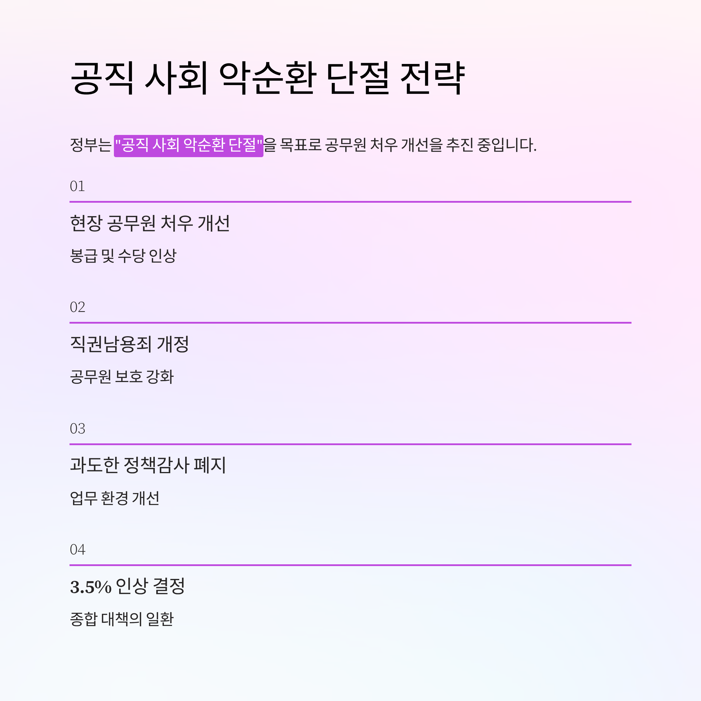 정부는 "공직 사회 악순환 단절"을 목표로 공무원 처우 개선을 추진 중입니다. 현장 공무원 처우 개선, 직권남용죄 개정, 과도한 정책감사 폐지 등이 포함된 종합 대책의 일환으로 3.5% 인상을 결정했습니다.