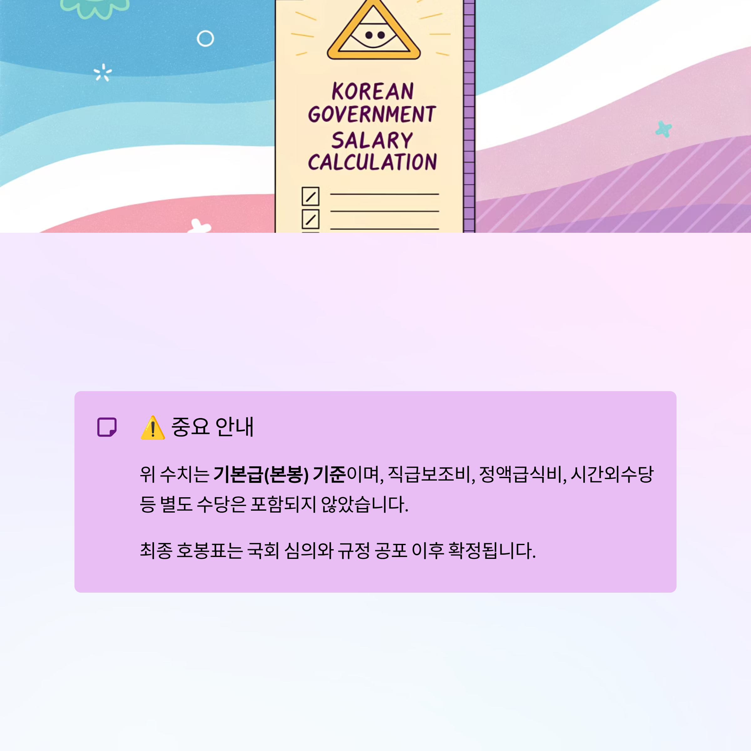 ⚠️ 주의: 위 수치는 기본급(본봉) 기준이며, 직급보조비, 정액급식비, 시간외수당 등 별도 수당은 포함되지 않았습니다. 최종 호봉표는 국회 심의와 규정 공포 이후 확정됩니다.