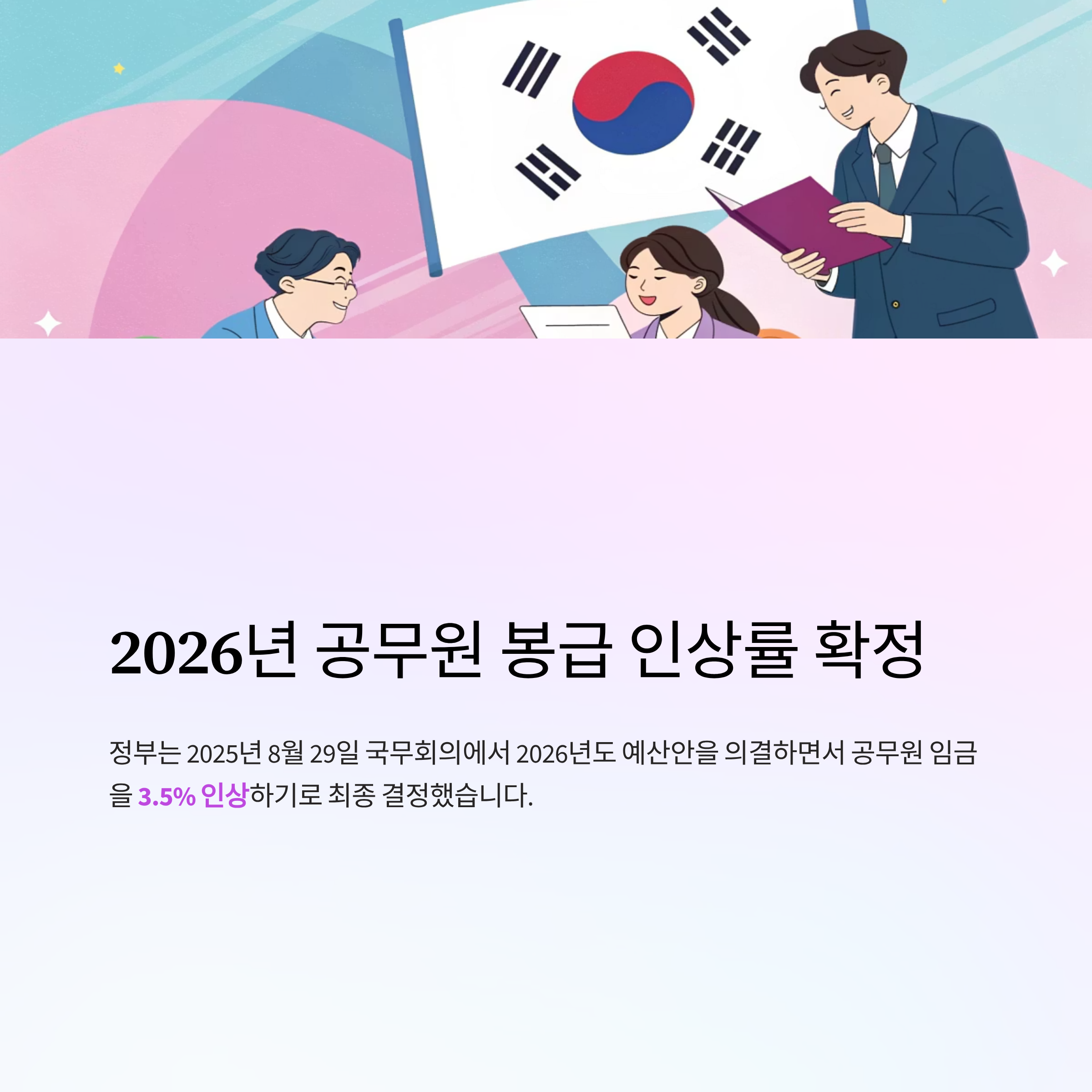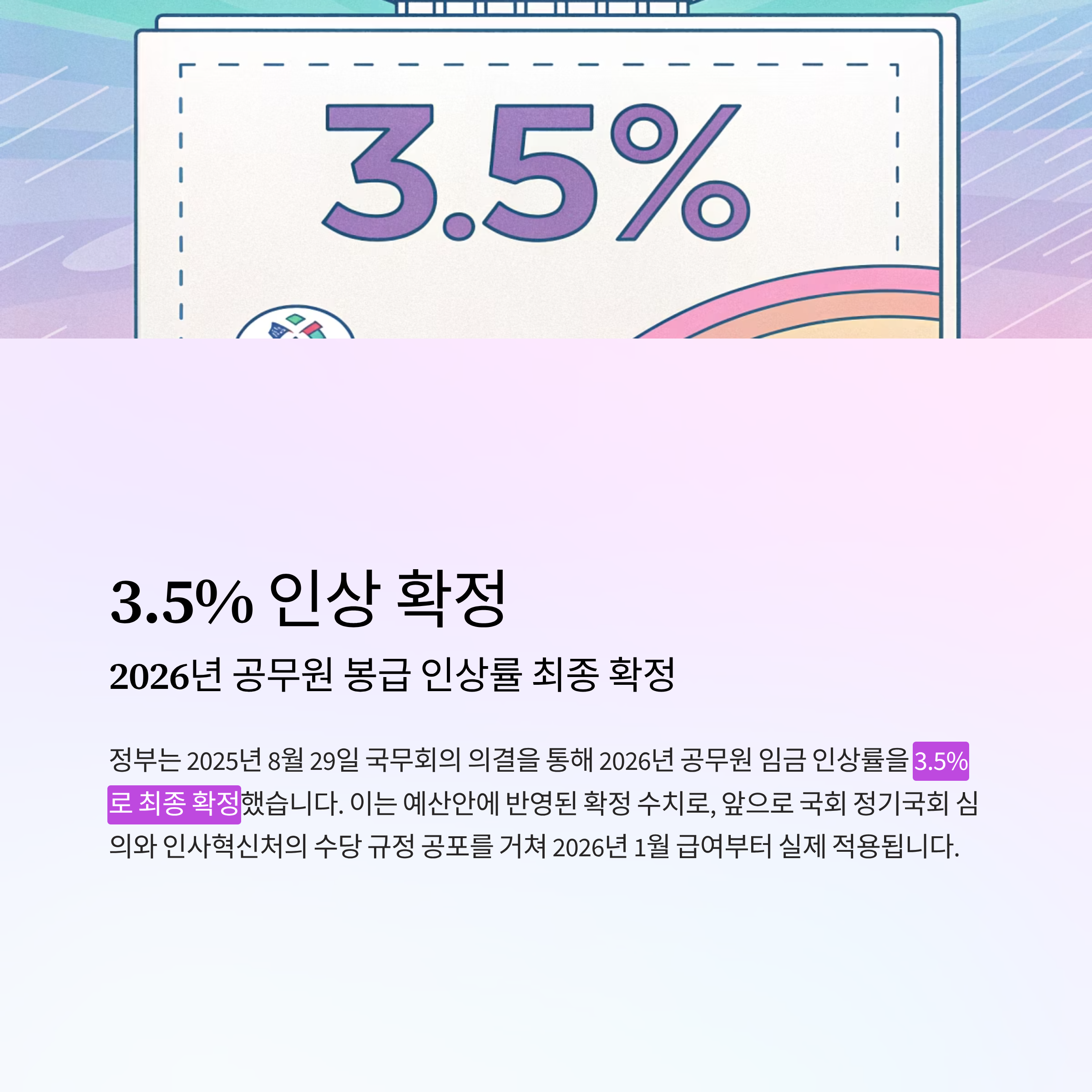 정부는 2025년 8월 29일 국무회의에서 2026년도 예산안을 의결하면서 공무원 임금을 3.5% 인상하기로 최종 결정했습니다.