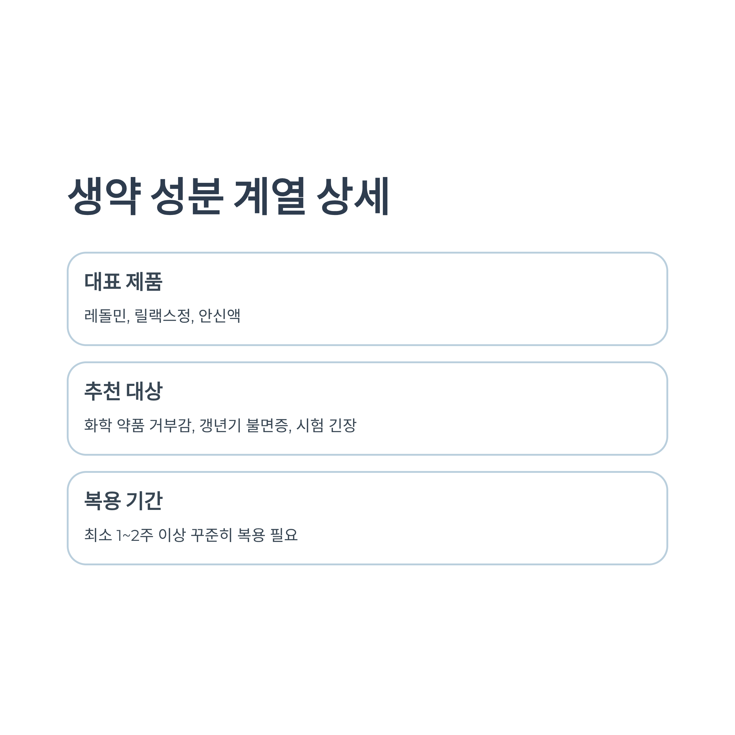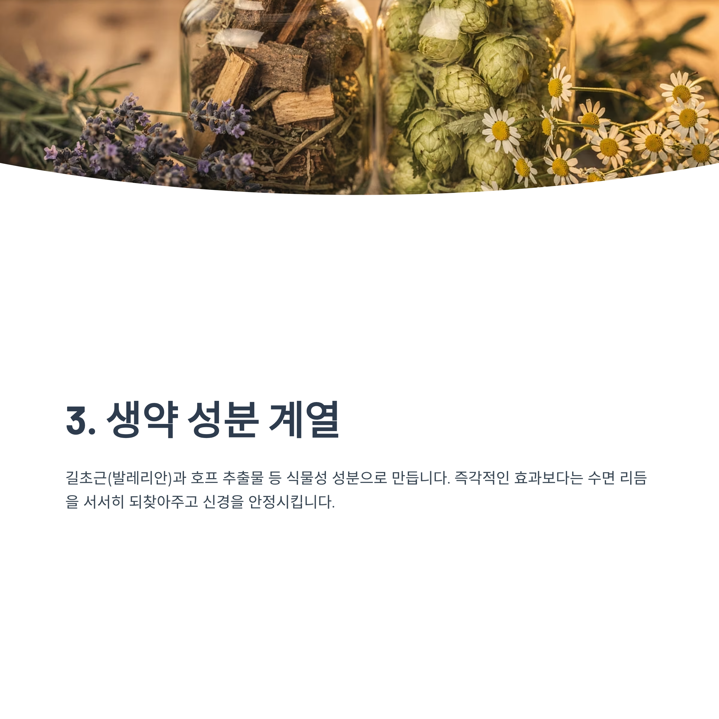 - 추천 대상: "화학 약품에 거부감이 있거나, 장기적으로 수면 패턴을 개선하고 싶은 분", "갱년기 증상으로 인한 불면증", "시험이나 면접을 앞두고 긴장해서 잠이 안 오는 분"에게 추천합니다. 효과를 제대로 보려면 최소 1~2주 이상 꾸준히 복용해야 수면 주기가 정상화됩니다.