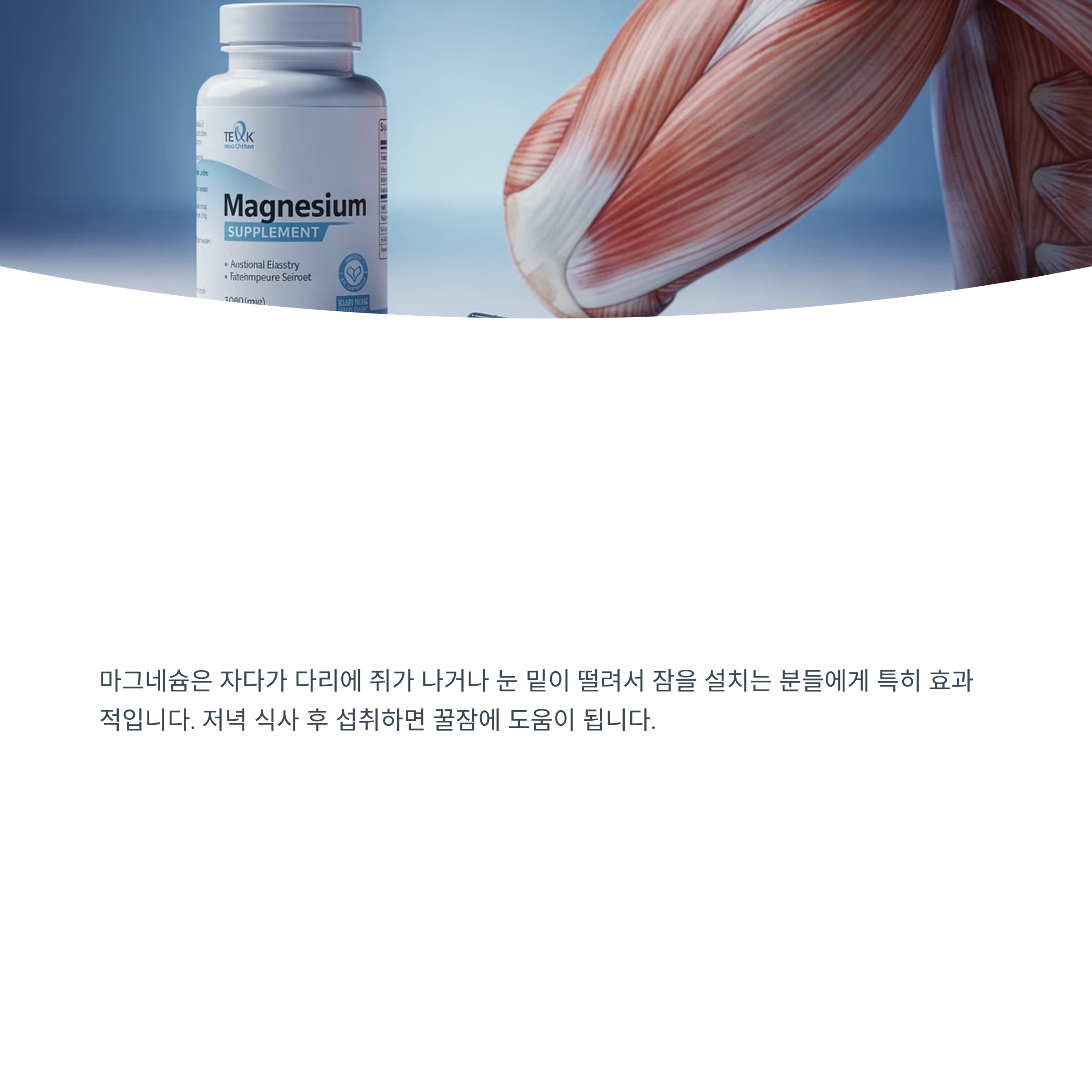 - 마그네슘: '천연 신경 안정제'라고 불립니다. 근육과 신경을 이완시키는 필수 미네랄입니다. 자다가 다리에 쥐가 나거나 눈 밑이 떨려서 잠을 설치는 분들에게 특히 효과적입니다. 저녁 식사 후 섭취하면 꿀잠에 도움이 됩니다.