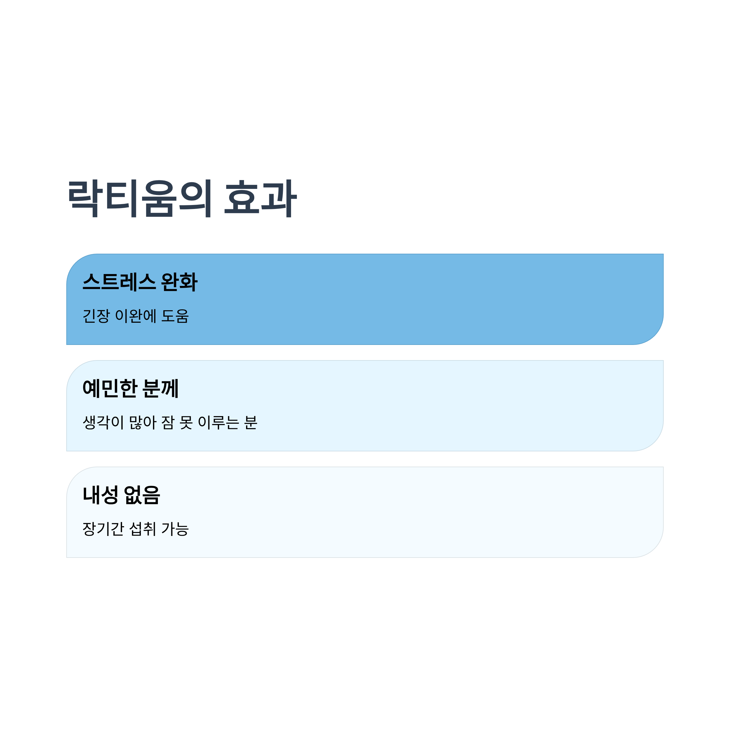- 효과: 스트레스로 인한 긴장 완화에 도움을 줍니다. 평소 예민하고 생각이 많아 잠을 못 이루는 분들에게 적합합니다. 장기간 섭취해도 내성이 없습니다.