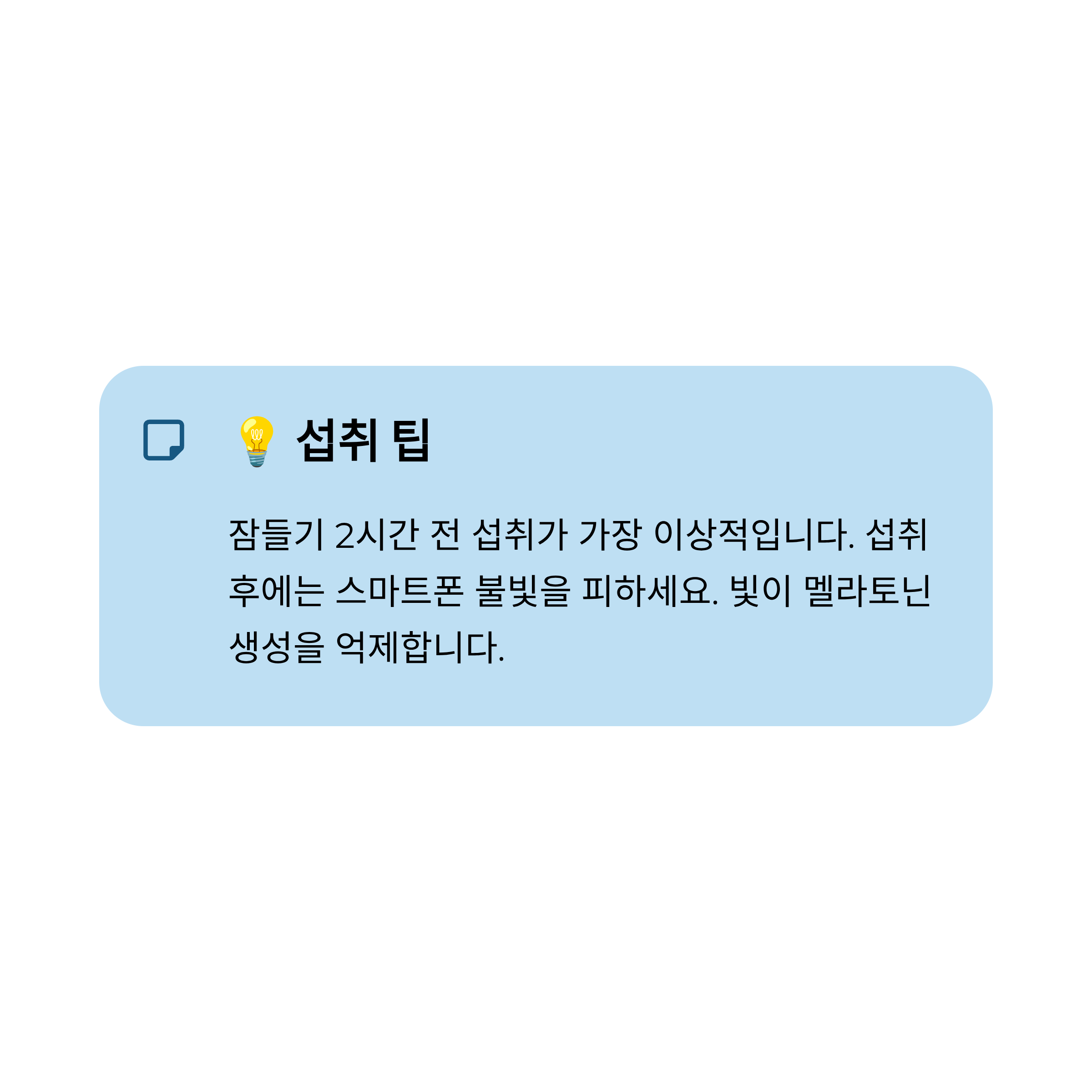 - 섭취법: 잠들기 2시간 전에 섭취하는 것이 가장 이상적입니다. 스마트폰 불빛을 보면 멜라토닌 생성이 억제되므로 섭취 후에는 빛을 차단해야 합니다.