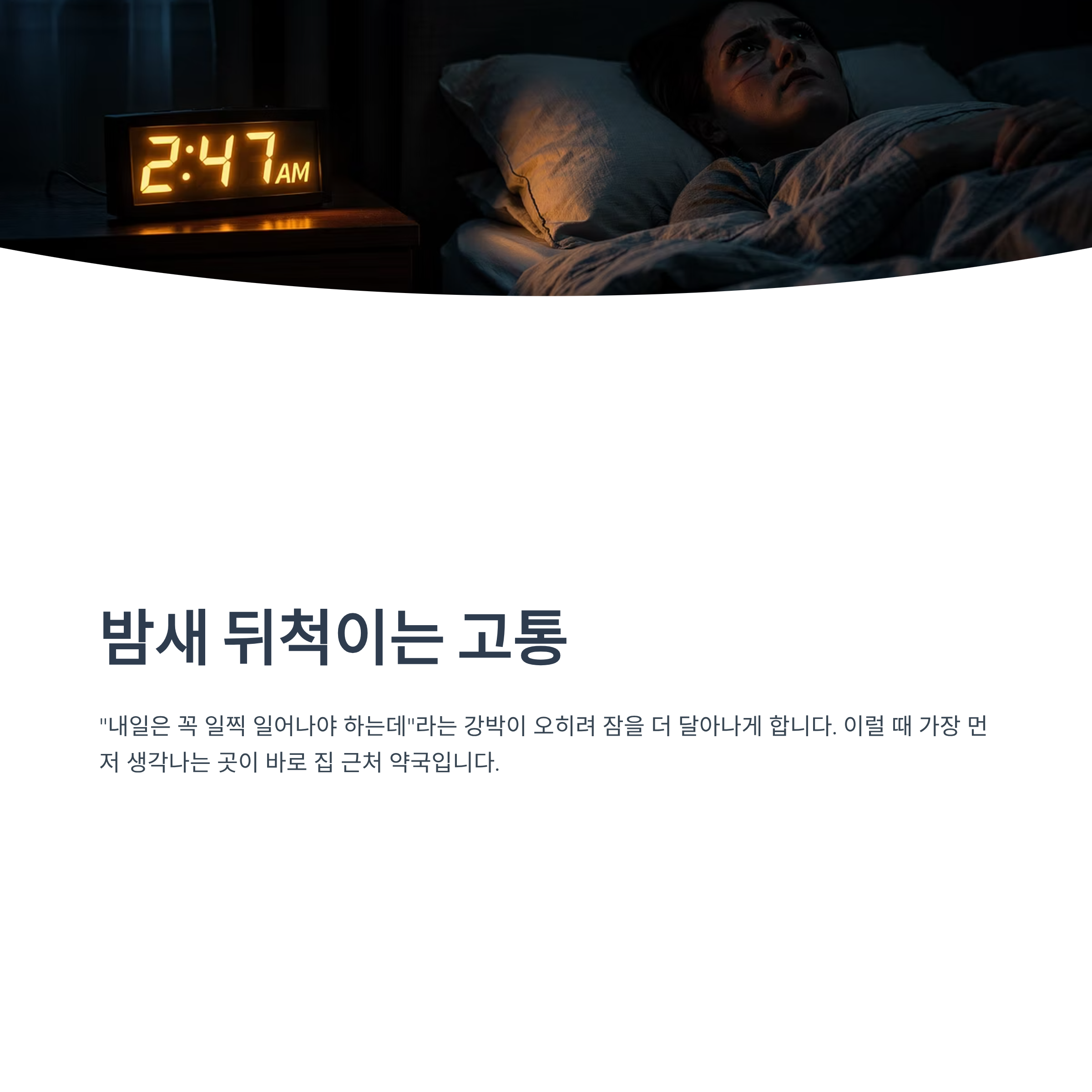 밤새 뒤척이다가 새벽을 맞이하는 고통, 겪어보지 않은 사람은 모릅니다. "내일은 꼭 일찍 일어나야 하는데"라는 강박이 오히려 잠을 더 달아나게 하죠. 이럴 때 가장 먼저 생각나는 곳이 바로 집 근처 약국입니다.