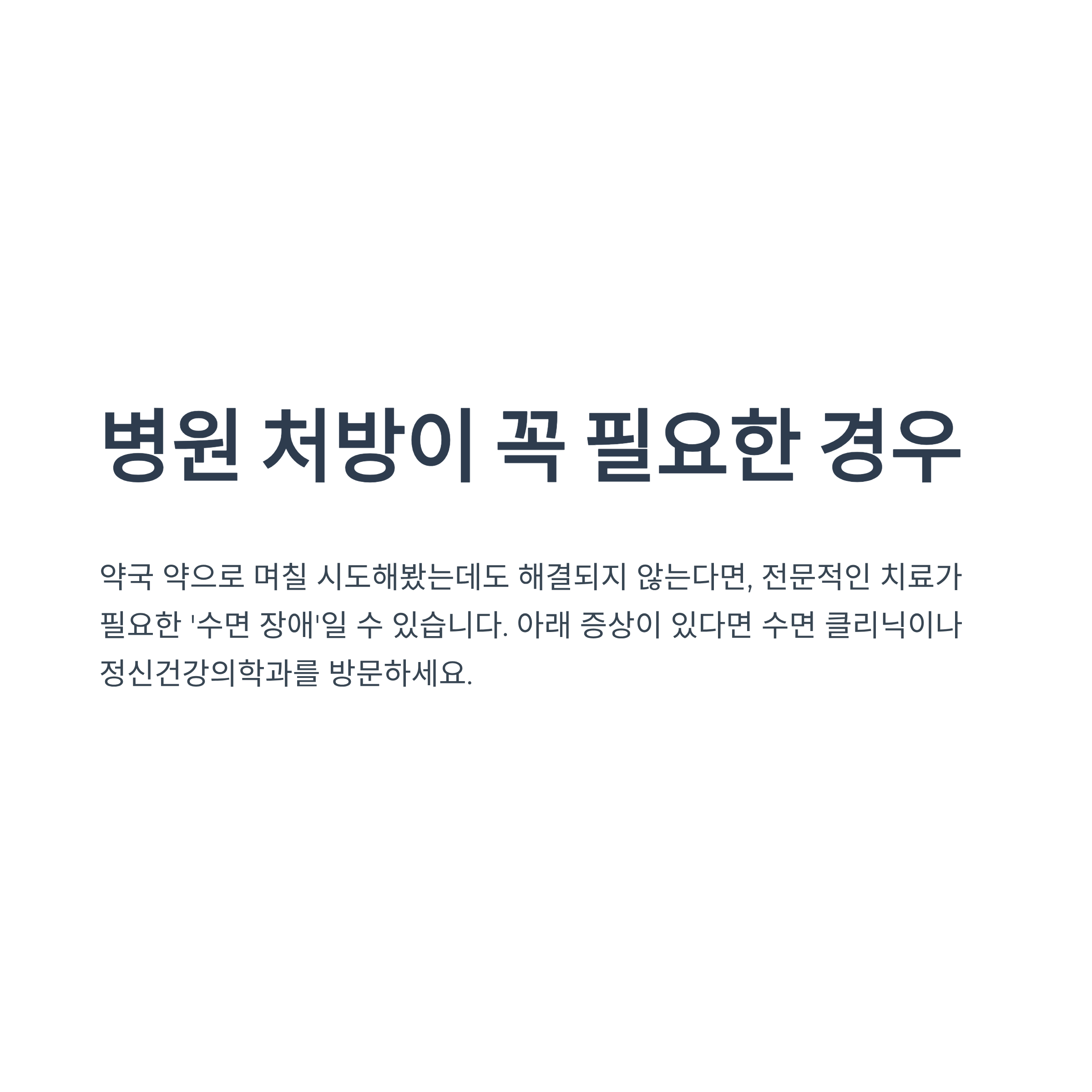 약국 약으로 며칠 시도해봤는데도 해결되지 않는다면, 그건 단순한 불면이 아니라 전문적인 치료가 필요한 '수면 장애'일 수 있습니다. 아래 증상이 있다면 지체 없이 수면 클리닉이나 정신건강의학과를 방문하여 근본적인 원인을 찾아야 합니다.