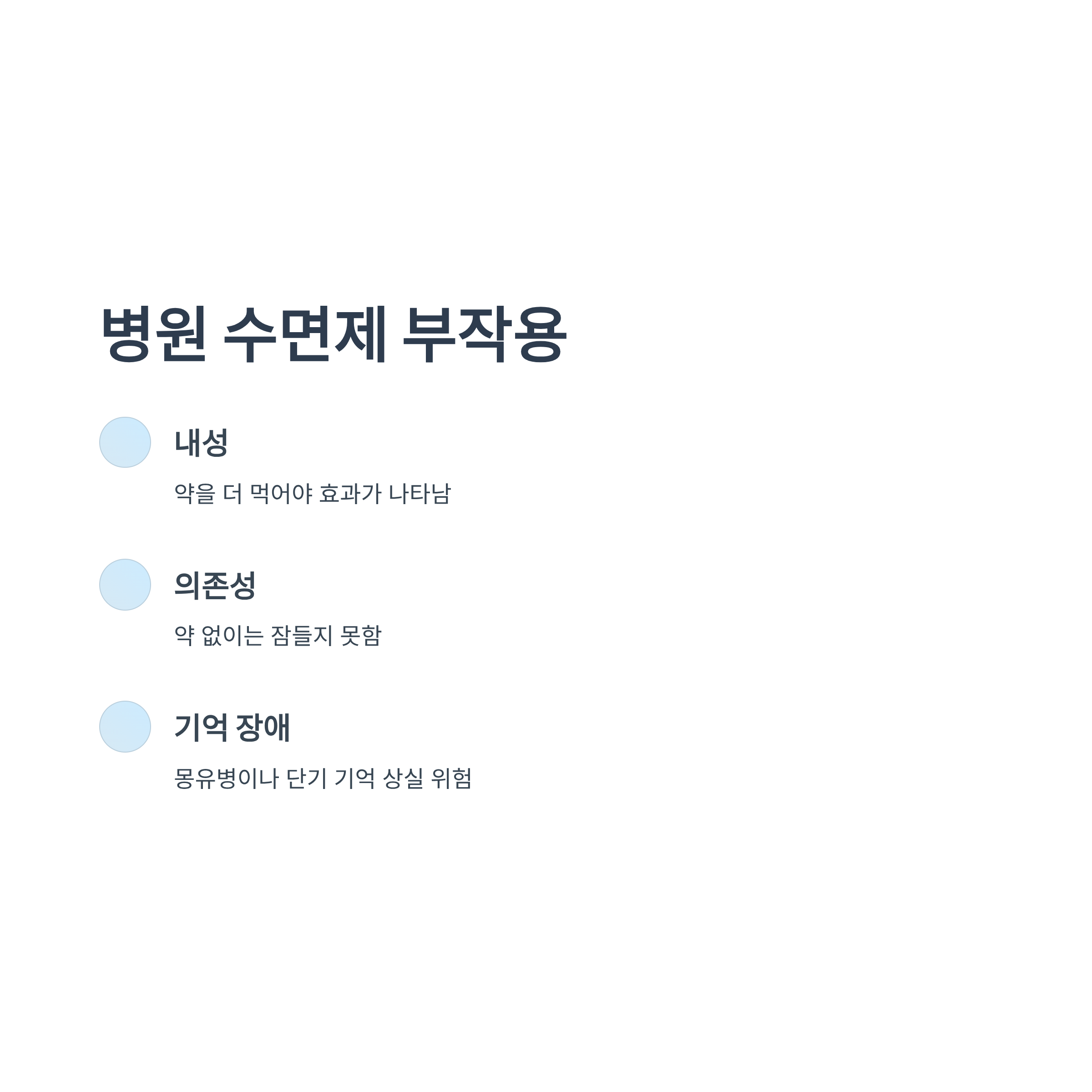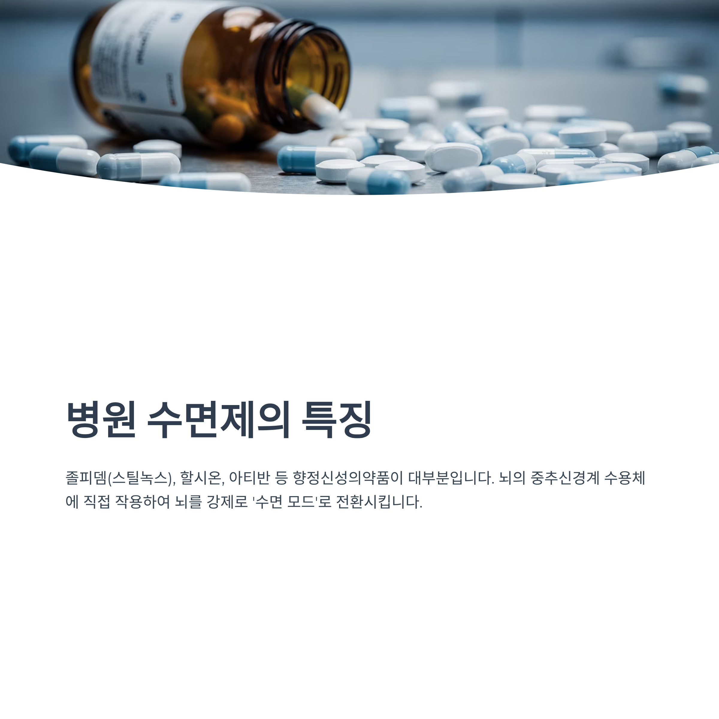 - 병원 수면제 (전문의약품): 졸피뎀(스틸녹스), 할시온, 아티반 등 향정신성의약품이 대부분입니다. 이 약들은 뇌의 중추신경계에 있는 수용체에 직접 작용하여 뇌를 강제로 '수면 모드'로 전환시킵니다. 효과는 매우 빠르고 확실하지만, 그만큼 위험 부담이 따릅니다. 장기 복용 시 내성(약을 더 먹어야 효과가 나타남), 의존성(약 없이는 못 잠), 몽유병이나 기억 삭제(단기 기억 상실) 등의 부작용 위험이 있어 반드시 의사의 처방과 철저한 복약 지도가 필요합니다.