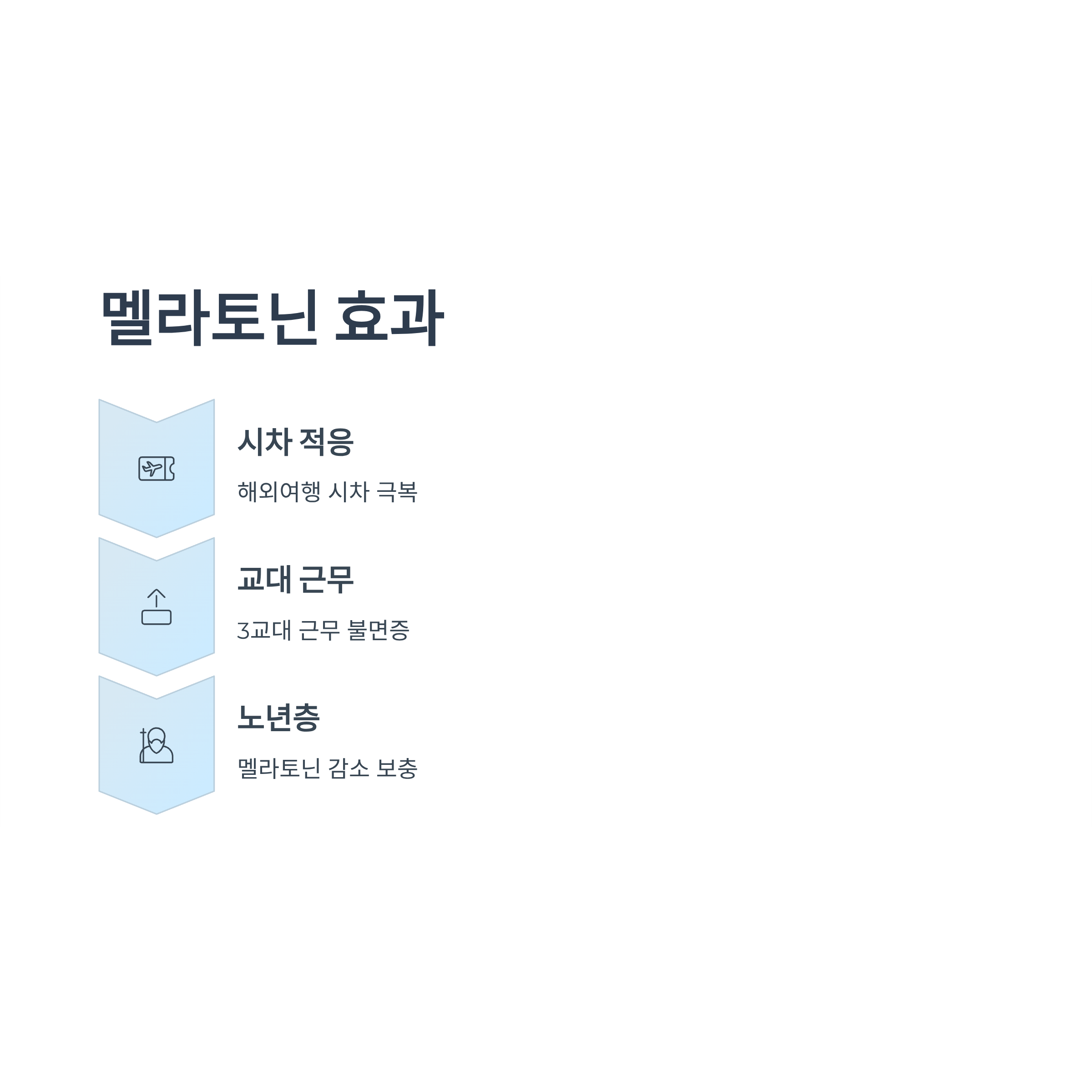 - 효과: 해외여행 시차 적응 실패나 3교대 근무로 인한 불면증, 혹은 멜라토닌 분비량이 줄어드는 노년층 불면증에 탁월합니다. 잠을 오게 하는 '신호탄' 역할을 합니다.