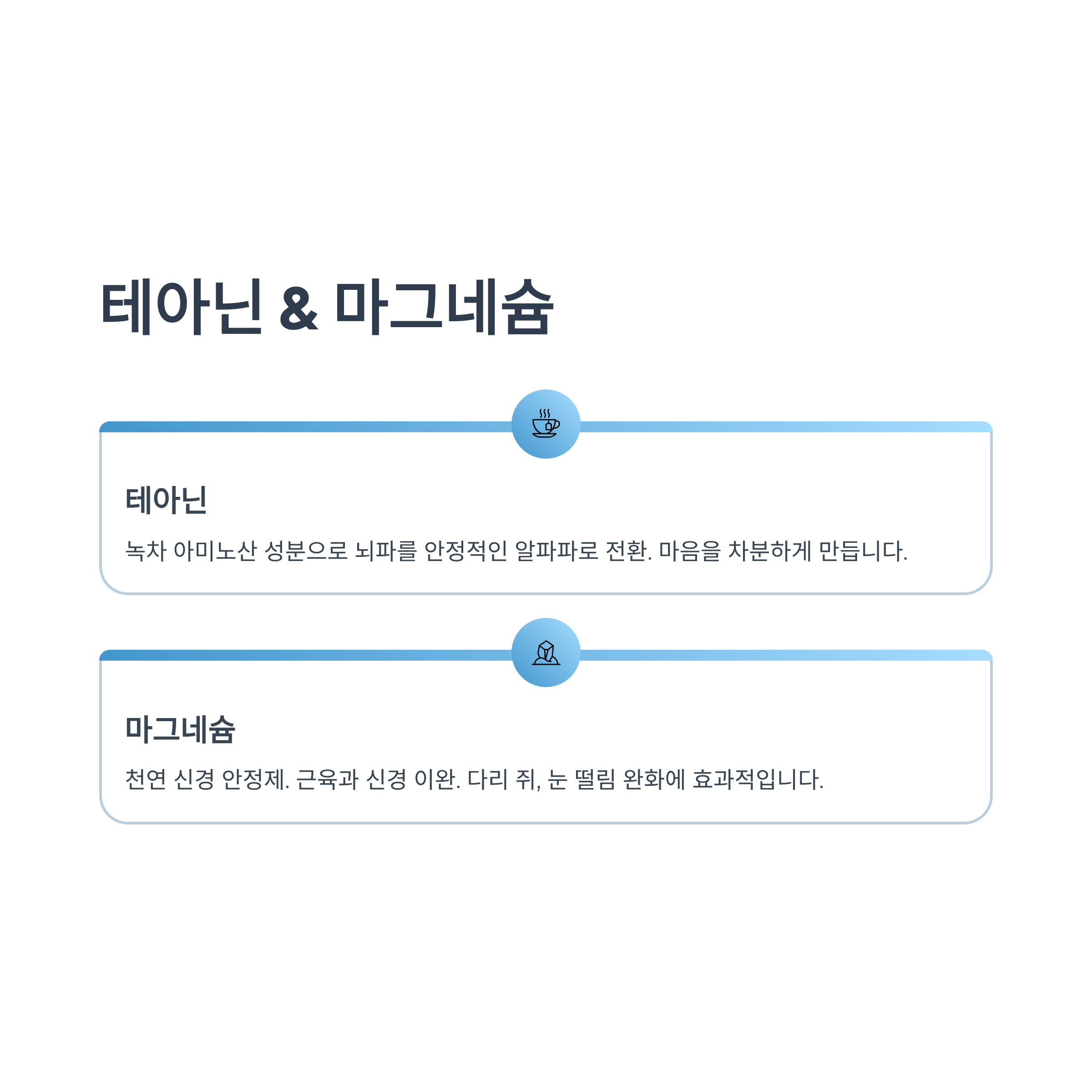 - 테아닌: 녹차에 들어있는 아미노산 성분으로, 뇌파를 안정적인 알파파로 바꿔주어 마음을 차분하게 만듭니다. 커피(카페인)와는 반대 작용을 한다고 보시면 됩니다.