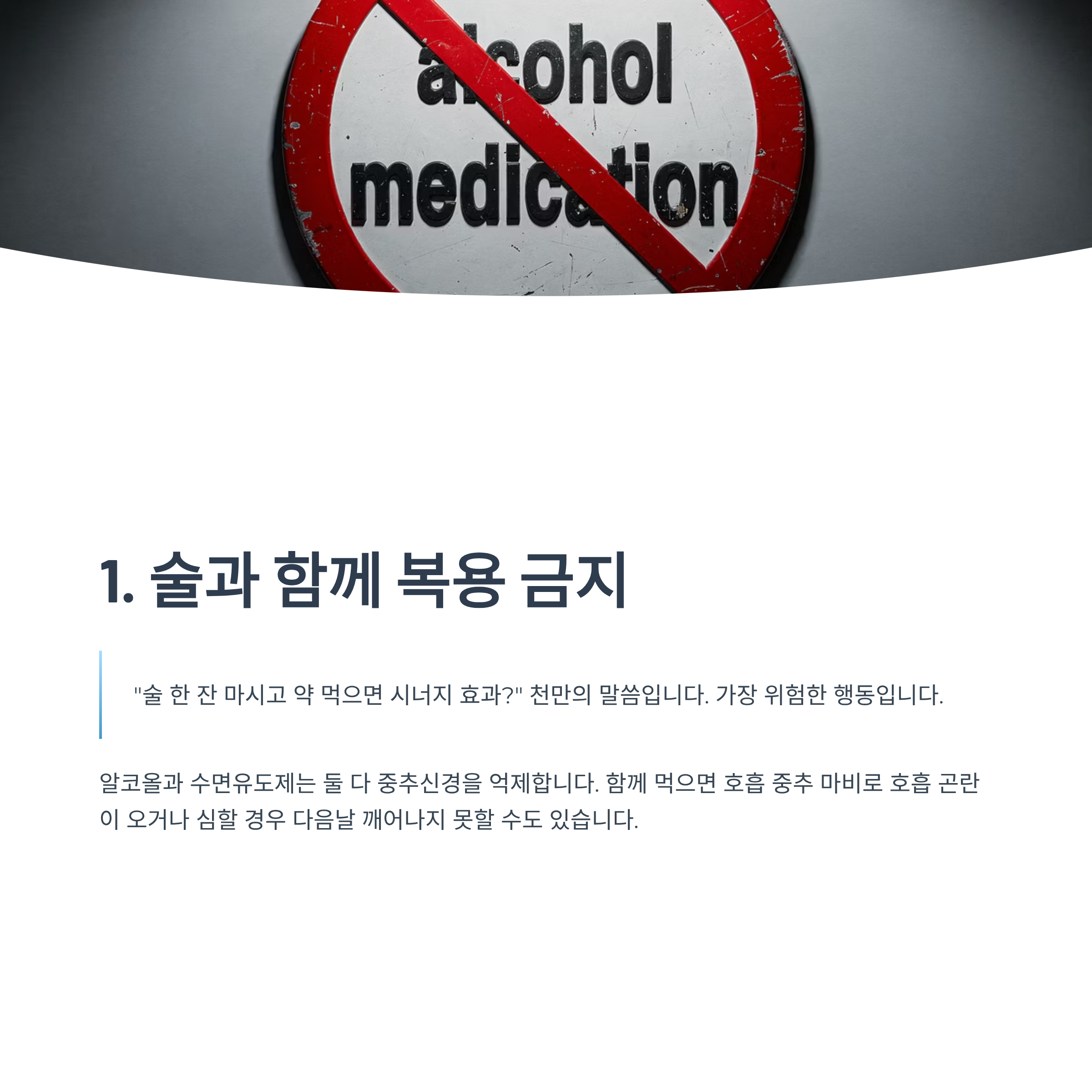 "술 한 잔 마시고 약 먹으면 시너지 효과로 푹 자겠지?" 천만의 말씀입니다. 가장 위험한 행동입니다. 알코올과 수면유도제는 둘 다 중추신경을 억제하는 작용을 합니다. 함께 먹으면 호흡 중추가 마비되어 호흡 곤란이 오거나, 심할 경우 다음날 영영 깨어나지 못할 수도 있습니다. 술을 마신 날은 절대 수면유도제를 드시지 마세요.