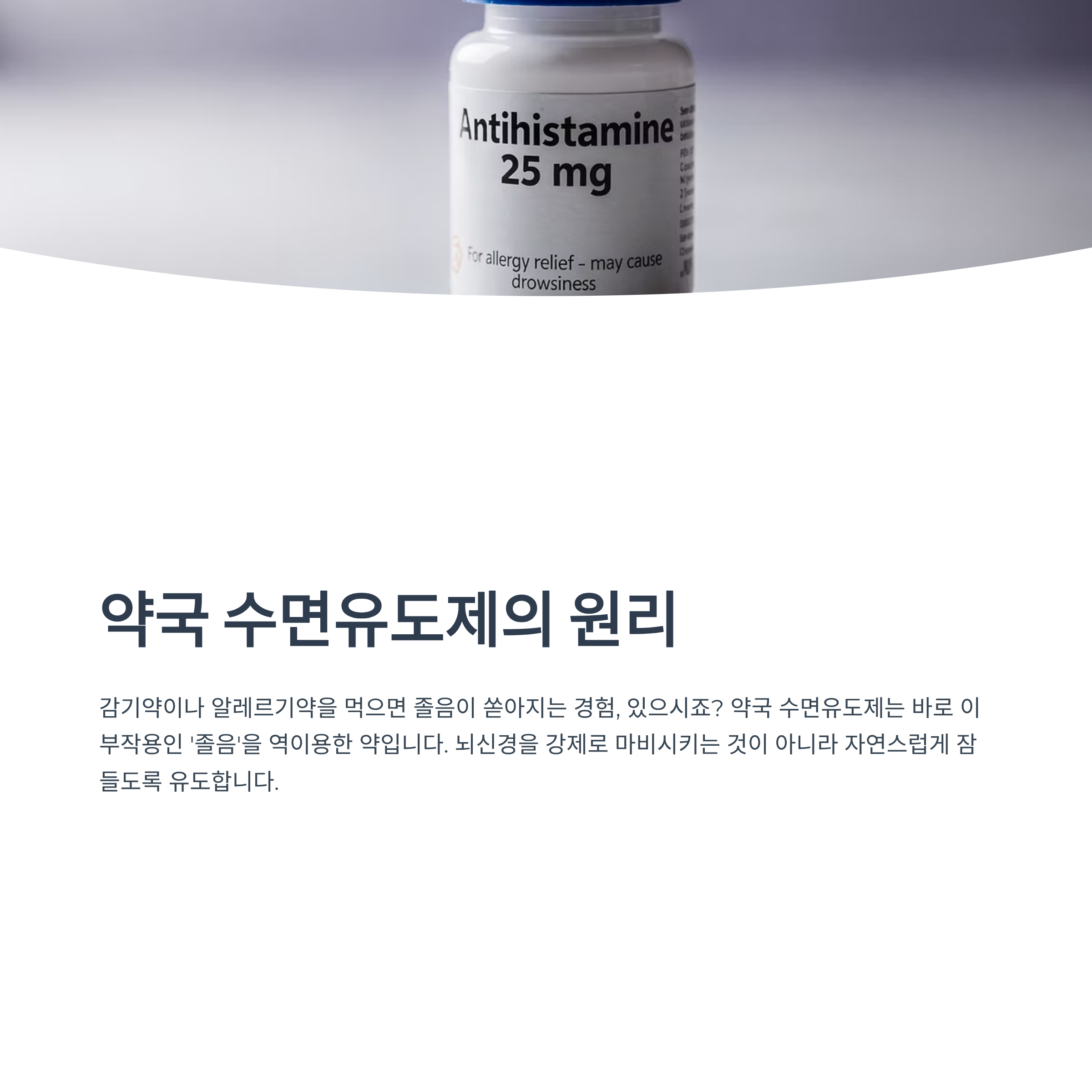 - 약국 수면유도제 (일반의약품): 우리가 흔히 먹는 감기약이나 콧물 알레르기약 성분(항히스타민제)을 먹으면 졸음이 쏟아지는 경험, 다들 있으실 겁니다. 약국 수면유도제는 바로 이 부작용인 '졸음'을 역이용하여 만든 약입니다. 뇌신경을 강제로 마비시키는 것이 아니라, 졸음이 오게끔 유도하여 자연스럽게 잠들도록 돕는 원리입니다. 따라서 향정신성의약품에 비해 의존성이나 중독성은 매우 낮지만, 불면증이 심한 분들에게는 효과가 상대적으로 약하게 느껴질 수 있습니다.
