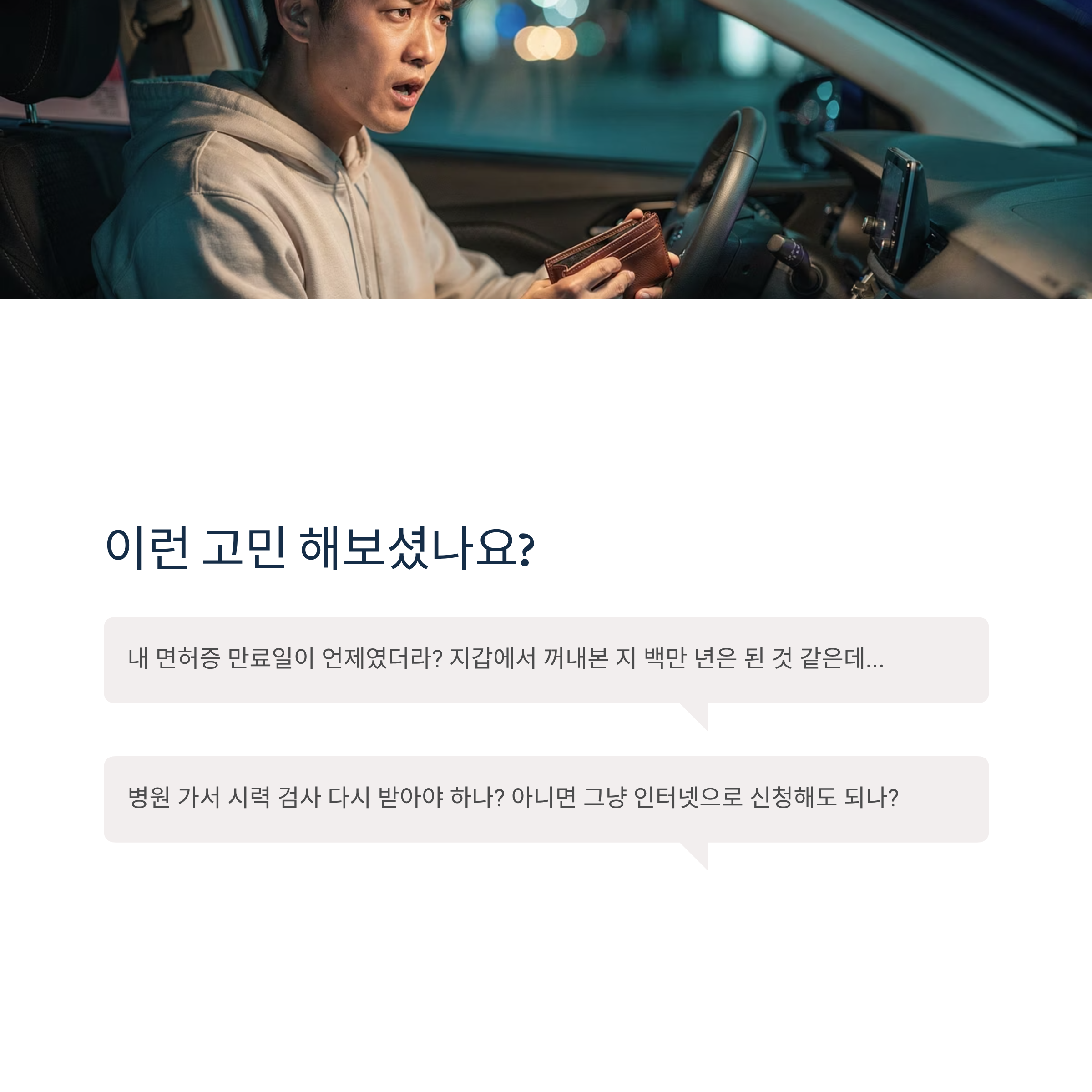 "내 면허증 만료일이 언제였더라? 지갑에서 꺼내본 지 백만 년은 된 것 같은데..."