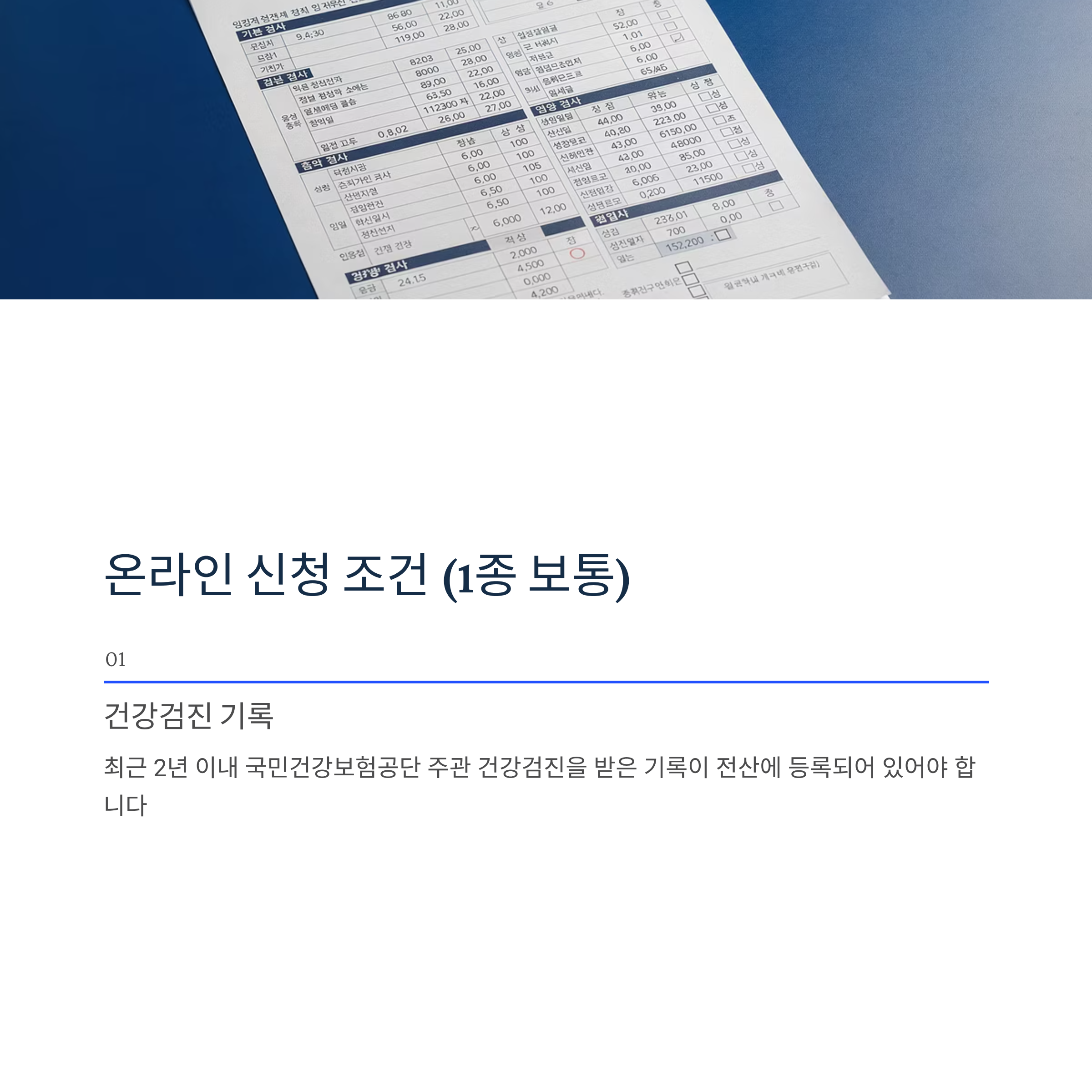 1. 최근 2년 이내 국민건강보험공단 주관 건강검진을 받은 기록이 전산에 등록되어 있어야 합니다.