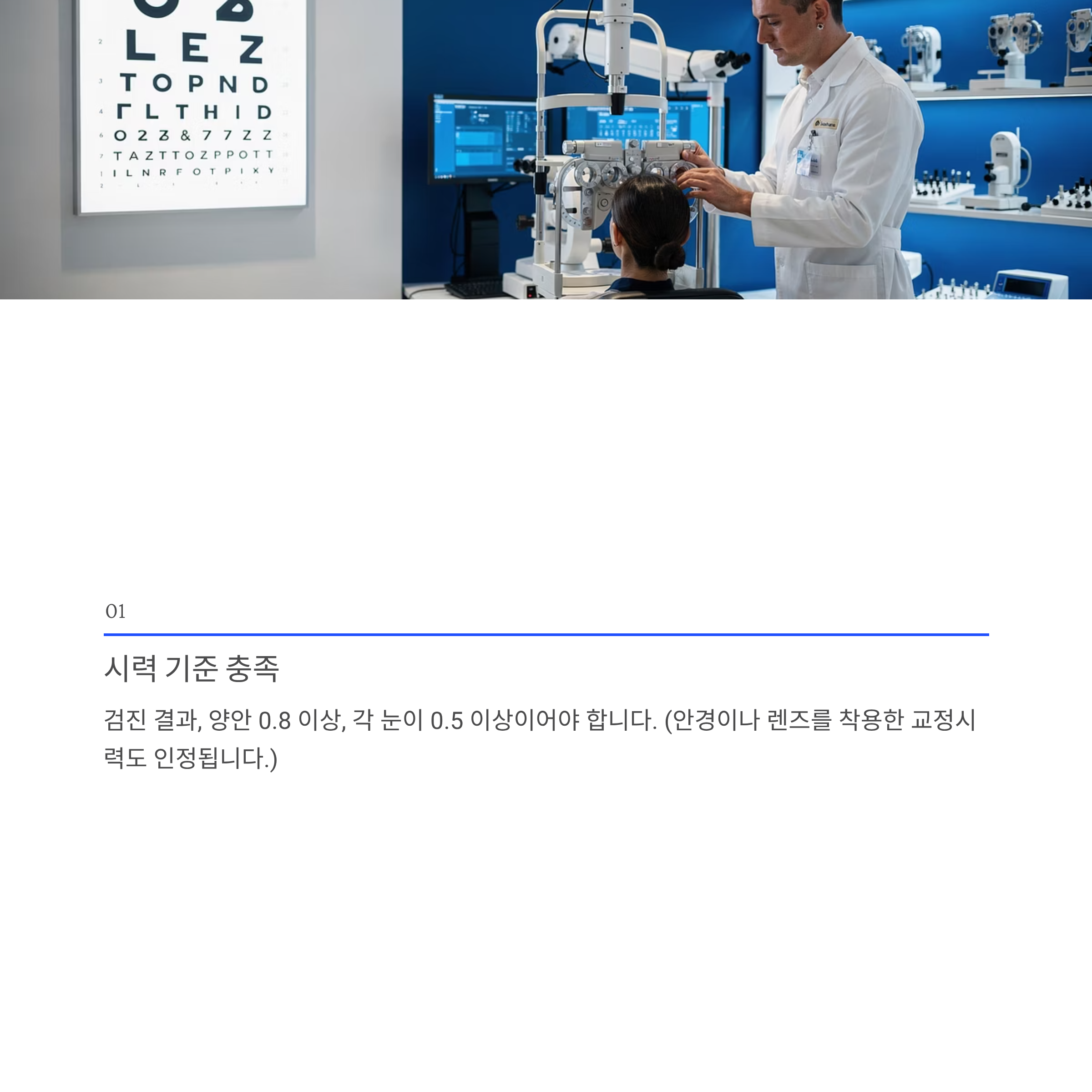 2. 시력 기준 충족: 검진 결과, 두 눈을 뜨고 쟀을 때(양안) 0.8 이상이어야 하며, 각 눈이 0.5 이상이어야 합니다. (안경이나 렌즈를 착용한 교정시력도 인정됩니다.)