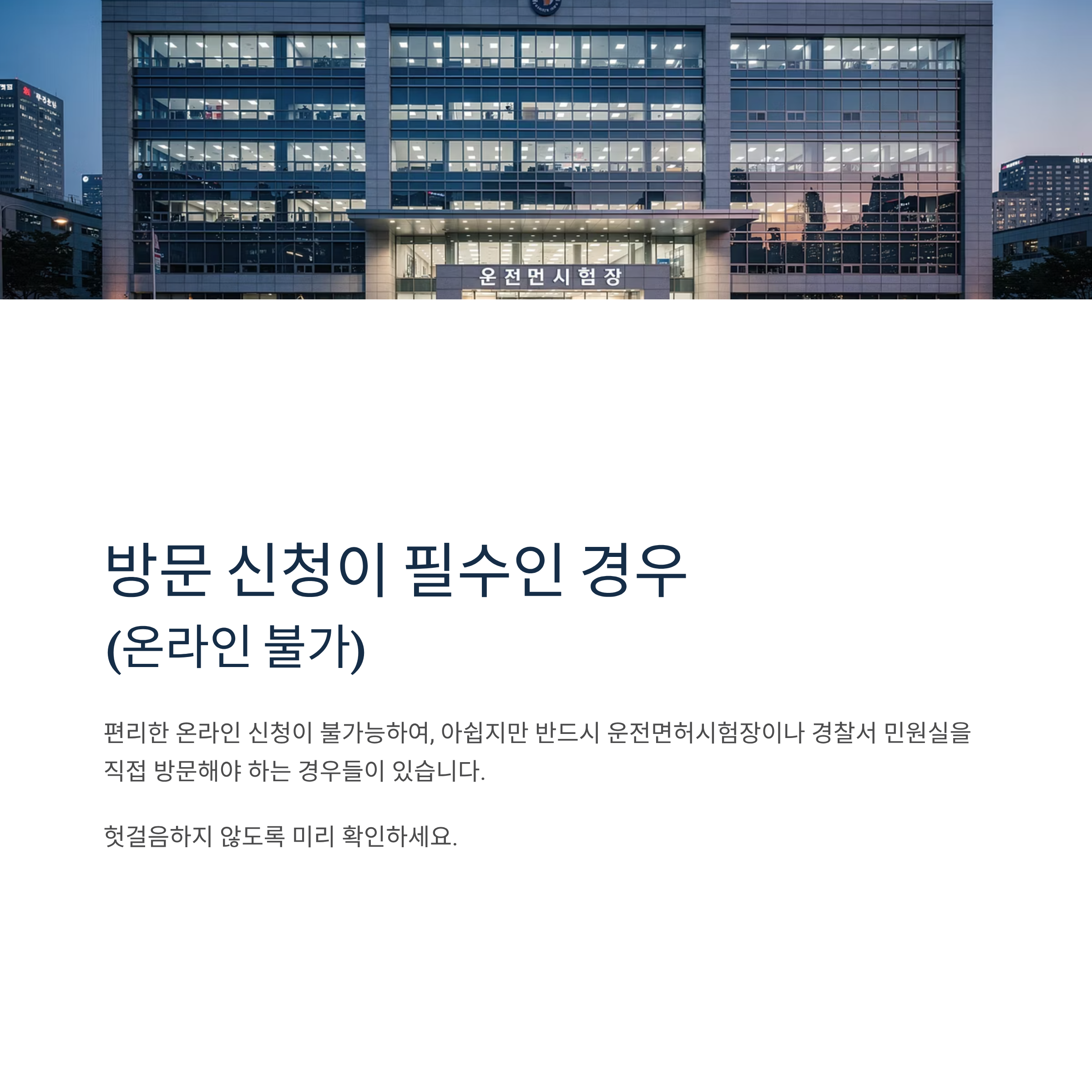 편리한 온라인 신청이 불가능하여, 아쉽지만 반드시 운전면허시험장이나 경찰서 민원실을 직접 방문해야 하는 경우들이 있습니다. 헛걸음하지 않도록 미리 확인하세요.