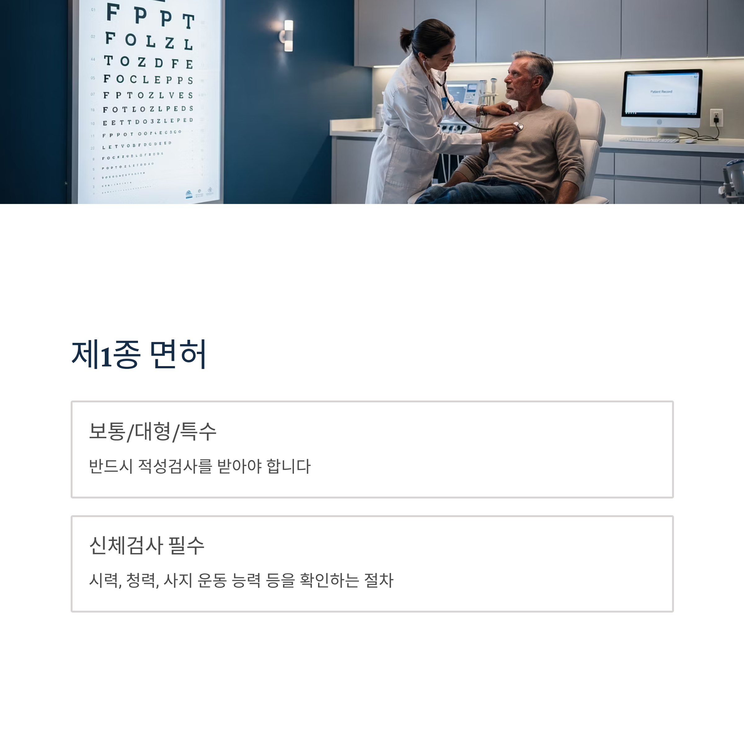 - 1종 대형 / 특수 면허 소지자: 대형이나 특수 면허는 신체검사 기준이 더 까다롭습니다(청력, 삼색 식별 등). 일반 건강검진 결과로는 대체가 불가능한 항목이 있어 시험장 내 신체검사실이나 지정 병원 방문이 필수입니다.