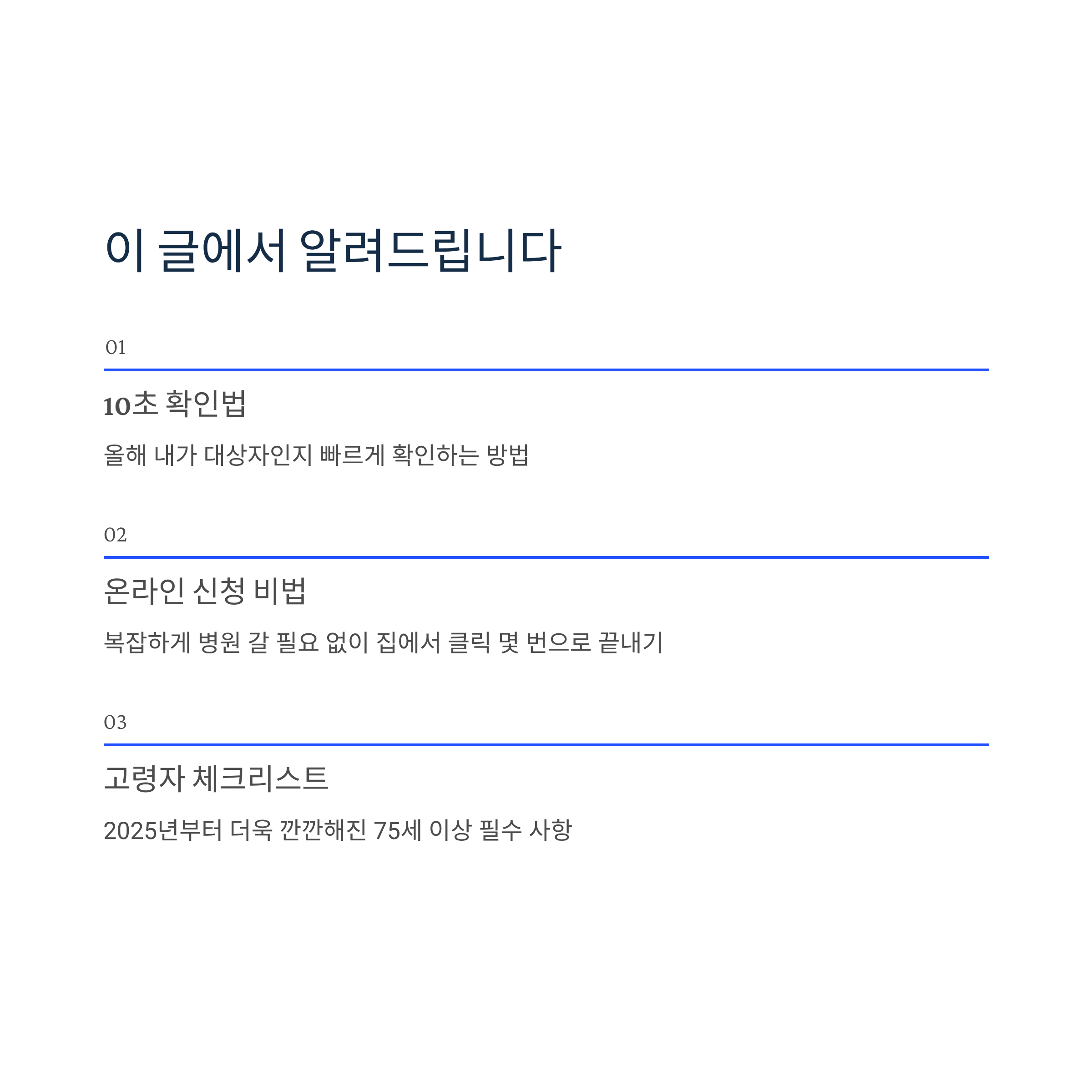 올해 내가 대상자인지 10초 만에 확인하는 방법부터, 복잡하게 병원 갈 필요 없이 집에서 클릭 몇 번으로 끝내는 온라인 신청 비법, 그리고 2025년부터 더욱 깐깐해진 75세 이상 고령 운전자 필수 체크리스트까지!