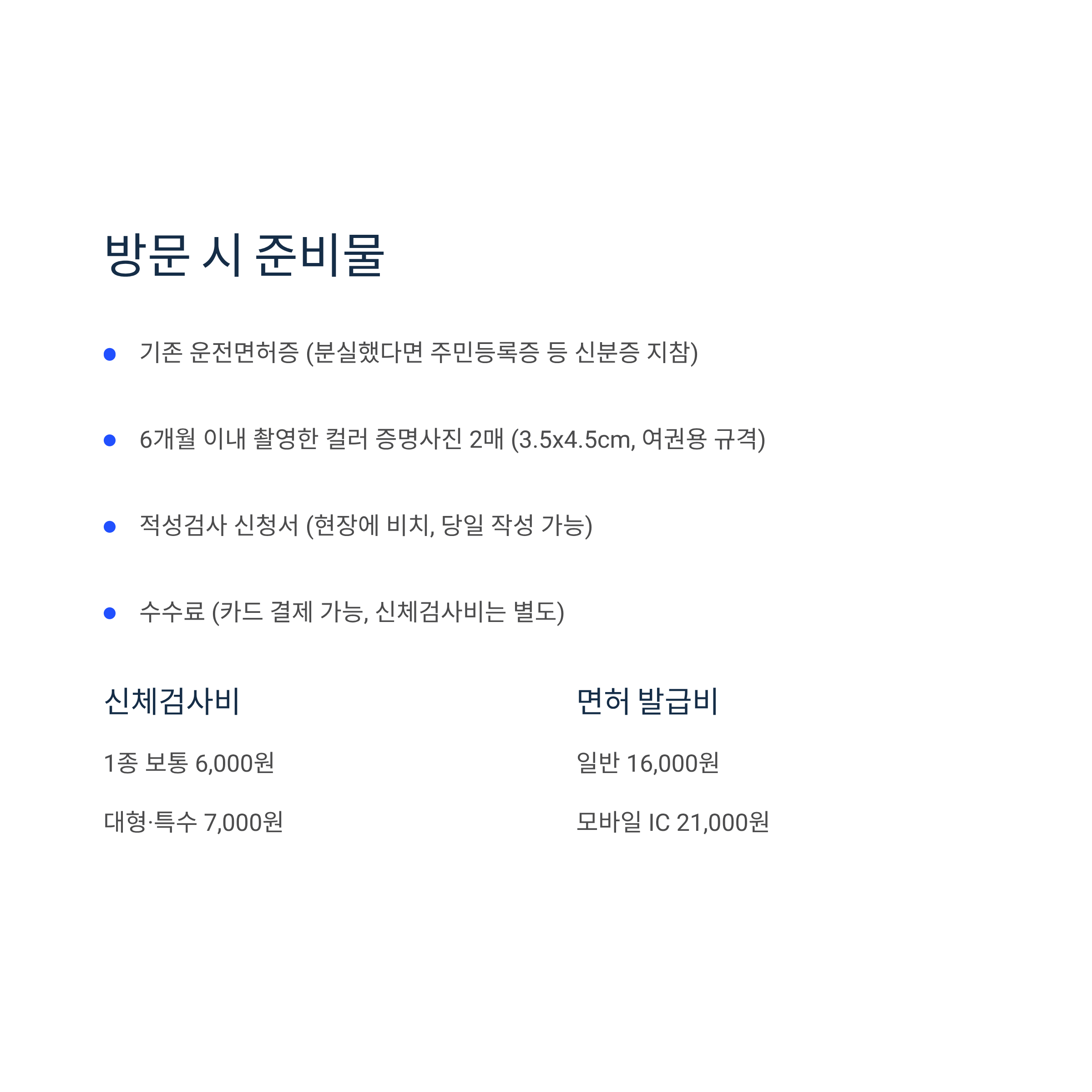 - 신체검사비: 1종 보통 6,000원 / 대형·특수 7,000원