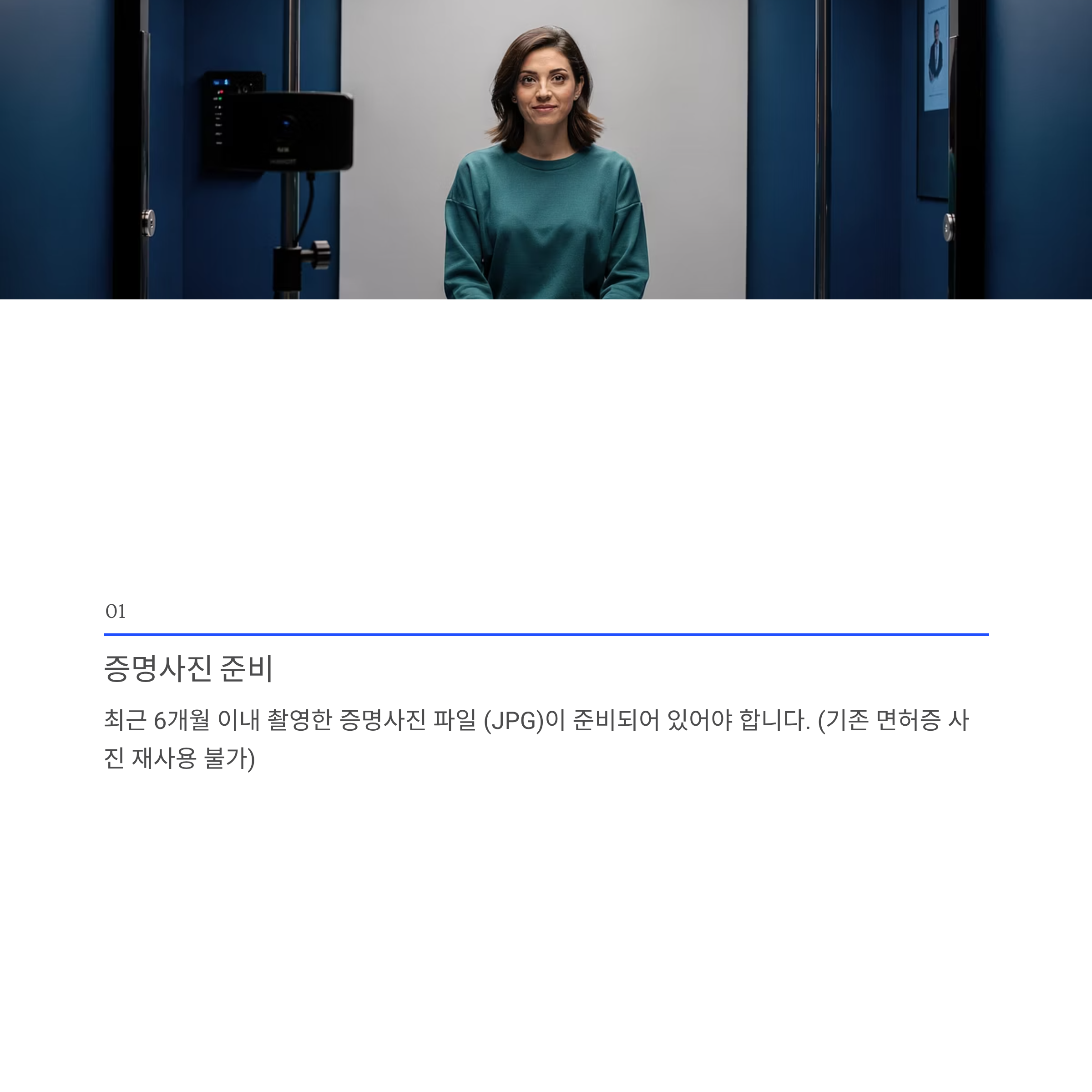 3. 최근 6개월 이내 촬영한 증명사진 파일 (JPG)이 준비되어 있어야 합니다. (기존 면허증 사진 재사용 불가)