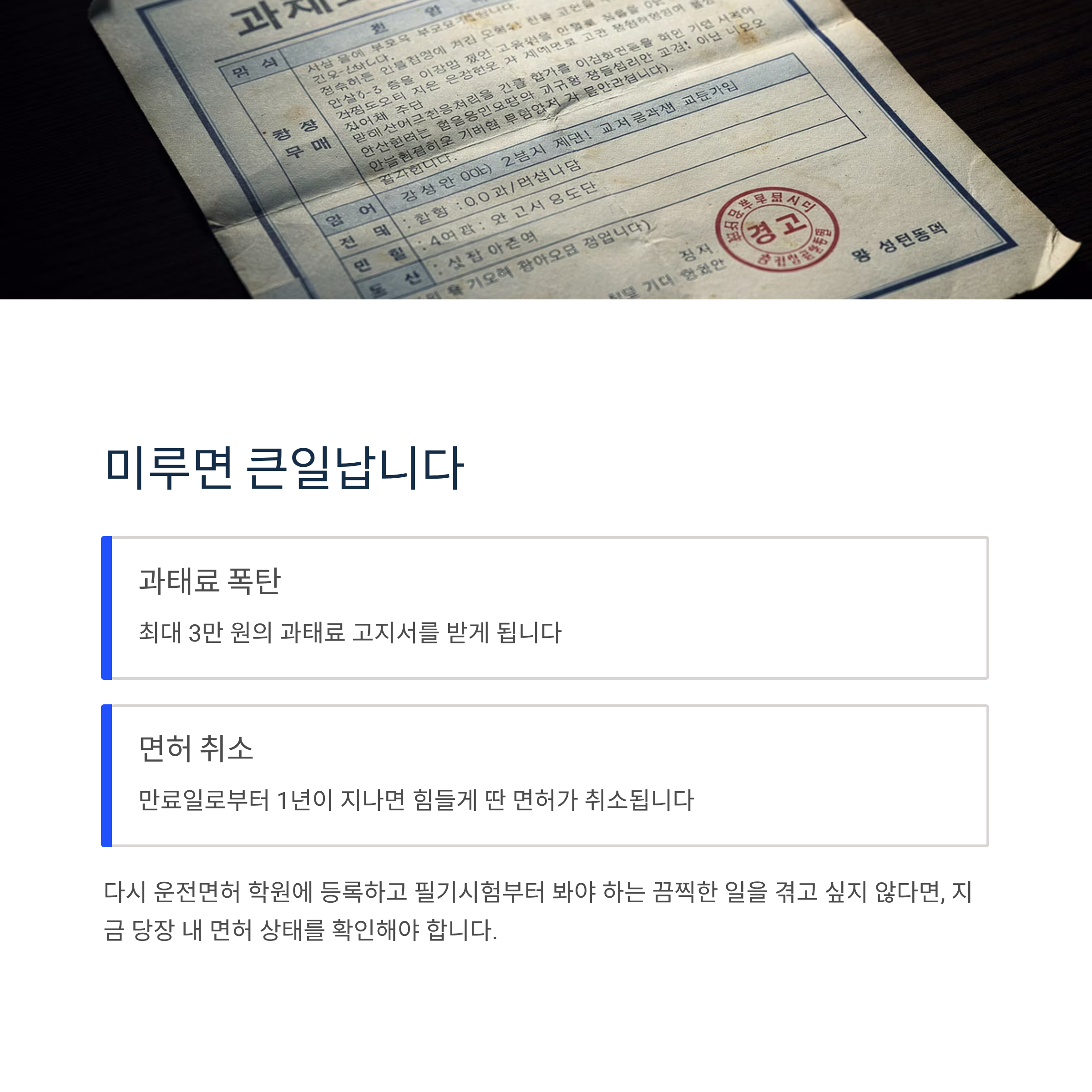 다시 운전면허 학원에 등록하고 필기시험부터 봐야 하는 끔찍한 일을 겪고 싶지 않다면, 지금 당장 내 면허 상태를 확인해야 합니다.