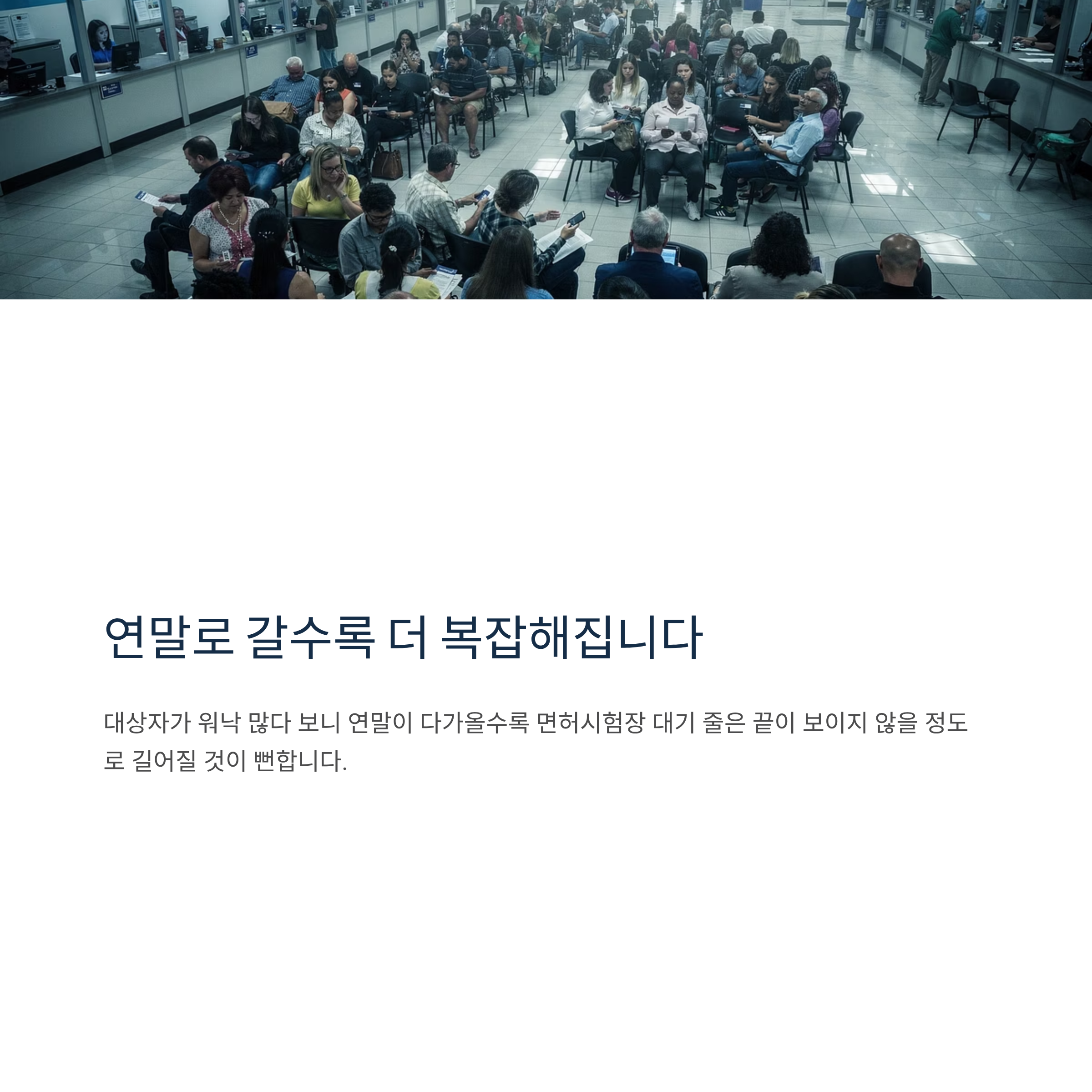 대상자가 워낙 많다 보니 연말이 다가올수록 면허시험장 대기 줄은 끝이 보이지 않을 정도로 길어질 것이 뻔합니다.