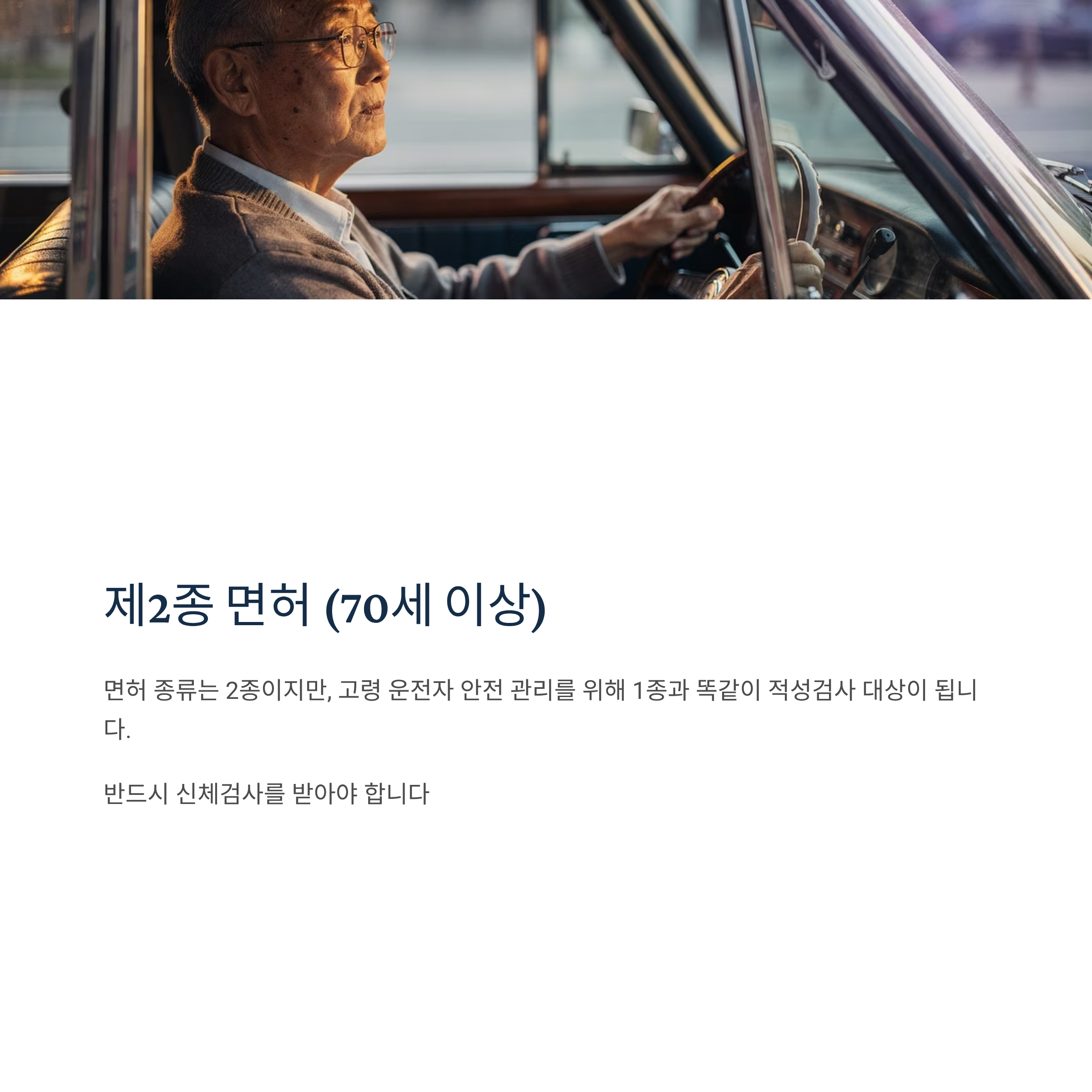 - 제2종 면허 (70세 이상): 면허 종류는 2종이지만, 고령 운전자 안전 관리를 위해 1종과 똑같이 적성검사 대상이 됩니다. 반드시 신체검사를 받아야 합니다.