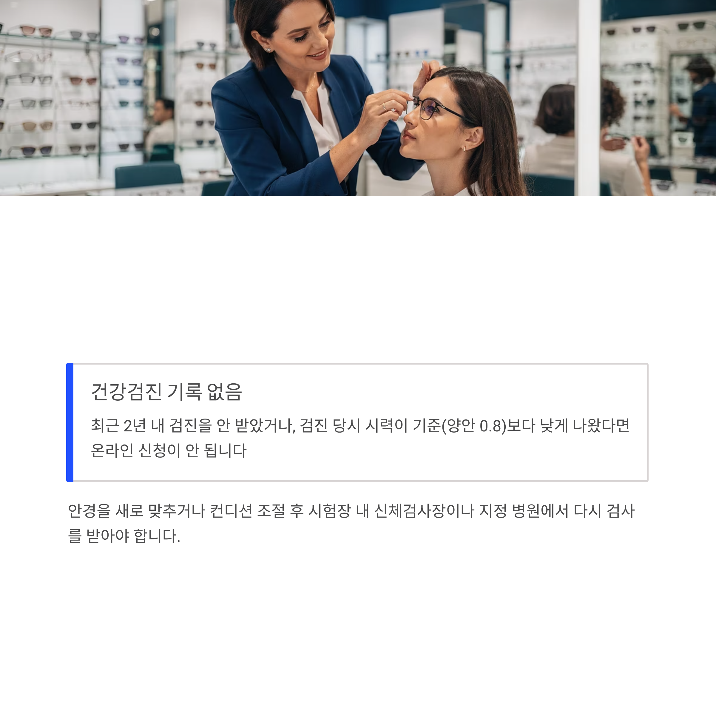 - 건강검진 기록이 없거나 시력 미달인 경우: 최근 2년 내 검진을 안 받았거나, 검진 당시 시력이 기준(양안 0.8)보다 낮게 나왔다면 온라인 신청이 안 됩니다. 안경을 새로 맞추거나 컨디션 조절 후 시험장 내 신체검사장이나 지정 병원에서 다시 검사를 받아야 합니다.