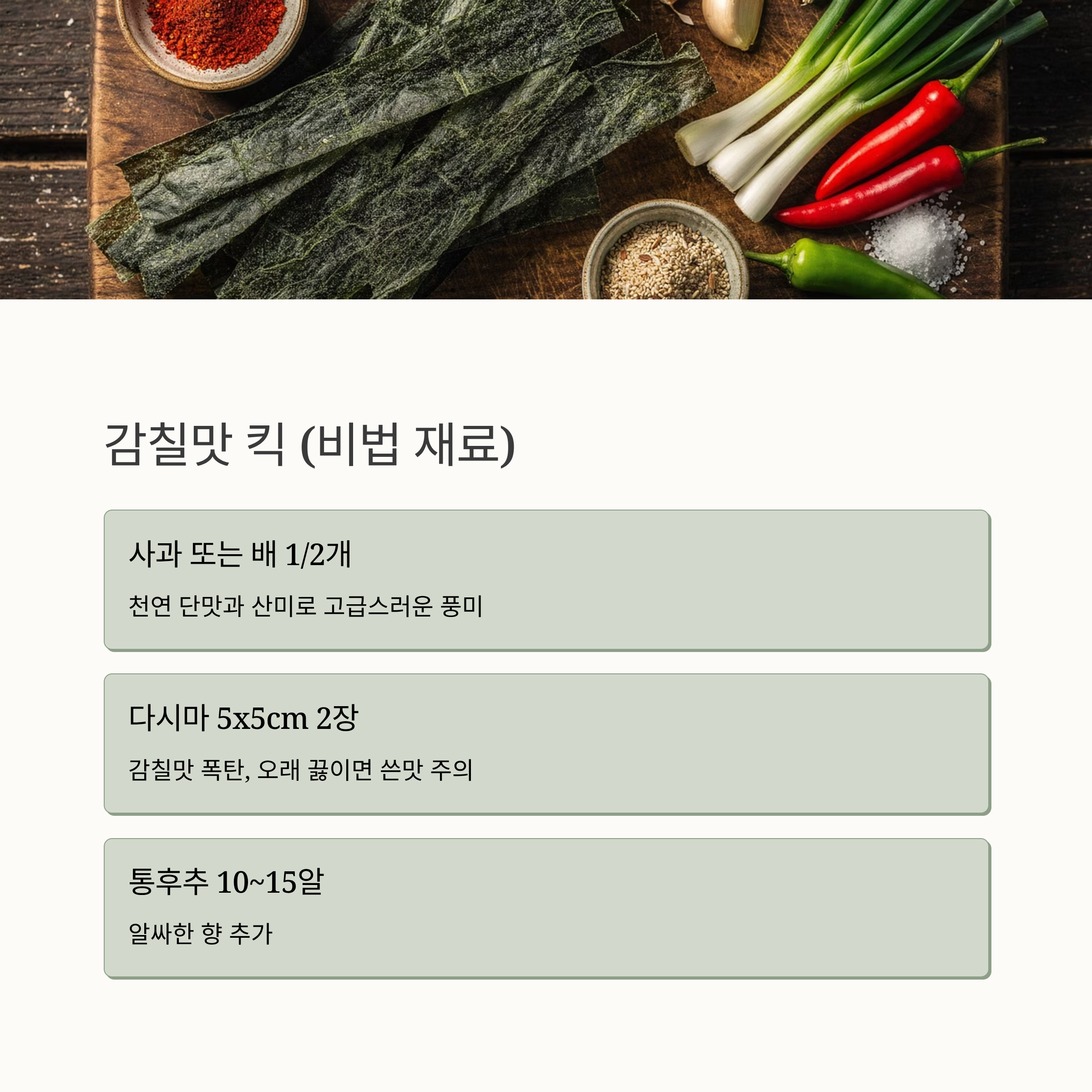 - 다시마: 5x5cm 2장 (감칠맛의 폭탄입니다. 단, 오래 끓이면 쓴맛과 진액이 나오니 주의해야 합니다.)