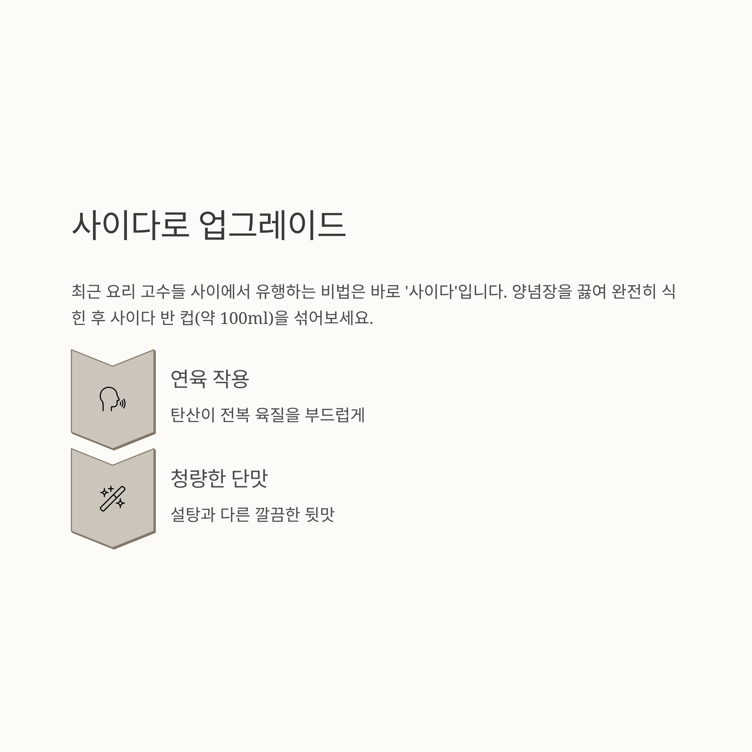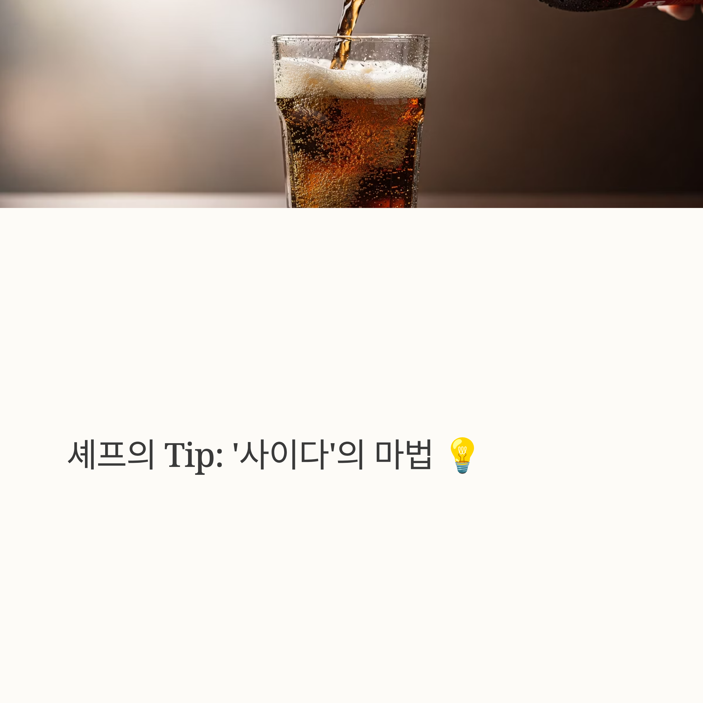 최근 요리 고수들 사이에서 유행하는 비법은 바로 '사이다'입니다. 양념장을 끓여서 완전히 식힌 후, 사이다를 반 컵(약 100ml) 정도 섞어보세요.