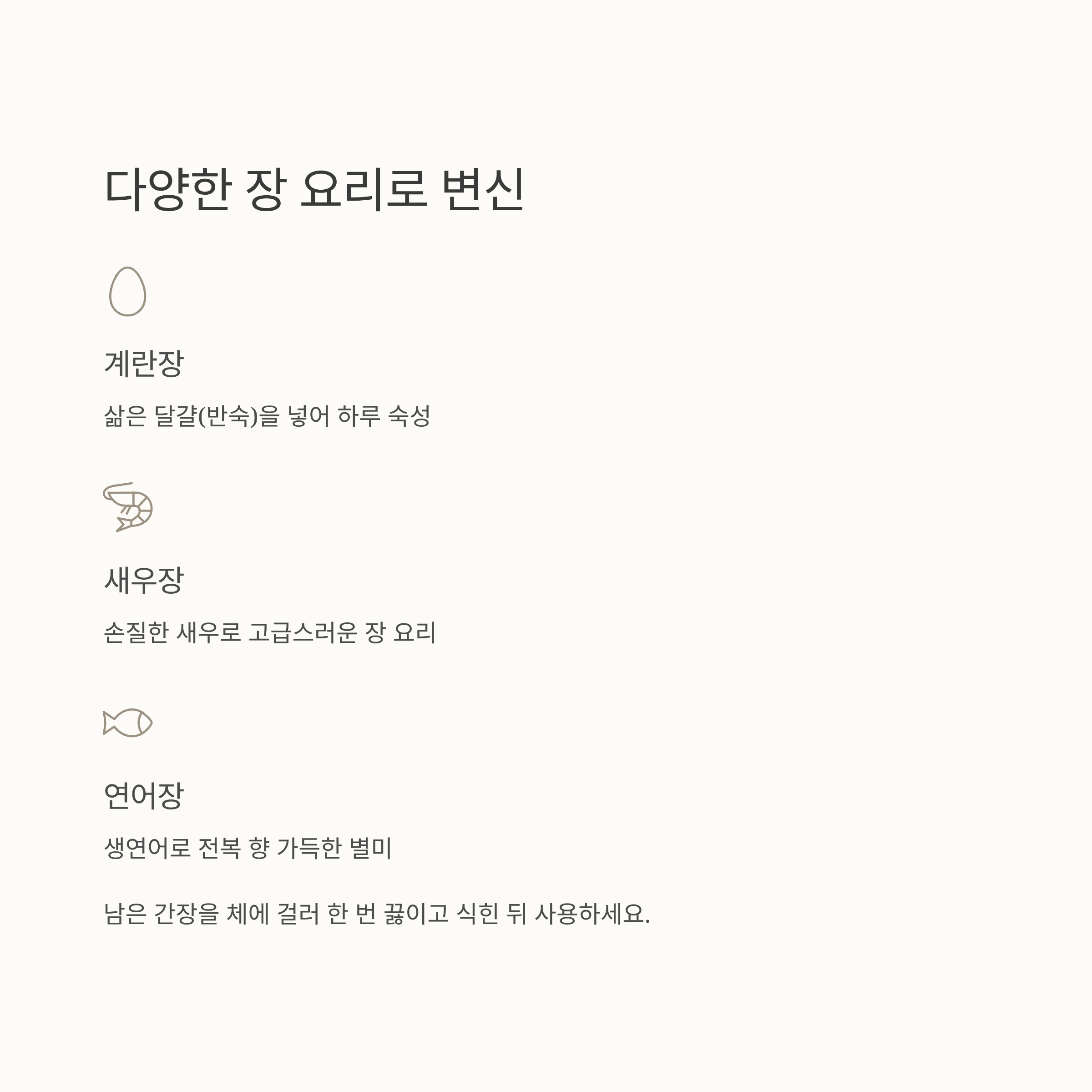 - 계란장 / 새우장 / 연어장: 남은 간장을 체에 걸러 한 번 끓이고 식힌 뒤, 삶은 달걀(반숙)이나 손질한 새우, 생연어를 넣어 하루만 숙성시켜 보세요. 전복 향이 배어 더 고급스러운 장 요리가 탄생합니다.