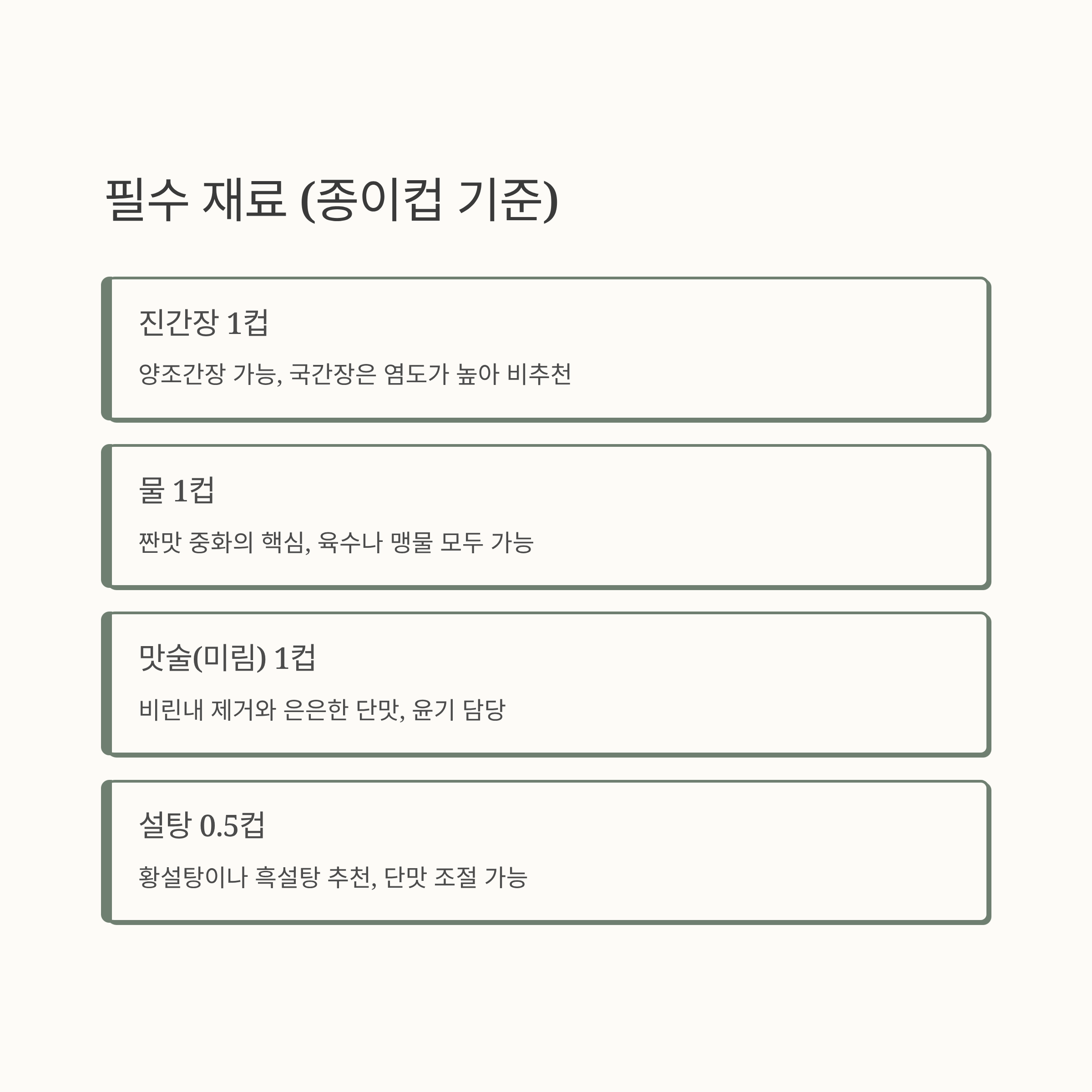 - 물: 1컵 (간장의 짠맛을 중화시키는 핵심입니다. 육수를 따로 내어 쓰면 좋지만, 맹물로도 충분히 훌륭한 맛을 낼 수 있습니다.)