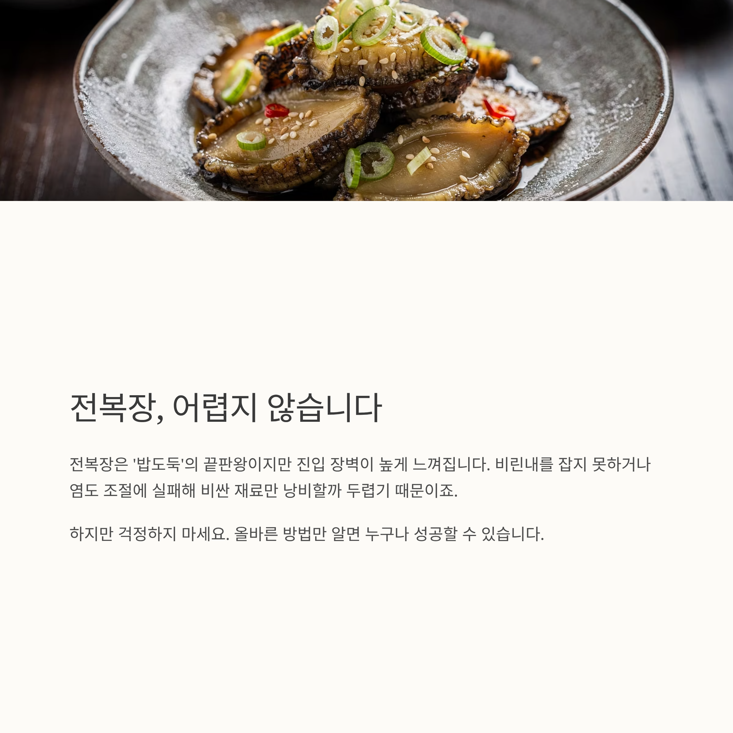전복장은 '밥도둑'계의 끝판왕이라 불릴 만큼 입맛 없을 때 최고의 반찬이지만, 막상 집에서 도전하기에는 진입 장벽이 높게 느껴집니다. 잘못하면 비린내를 잡지 못하거나 염도 조절에 실패해 비싼 재료만 낭비하게 될까 봐 두렵기 때문이죠. 하지만 걱정하지 마세요.
