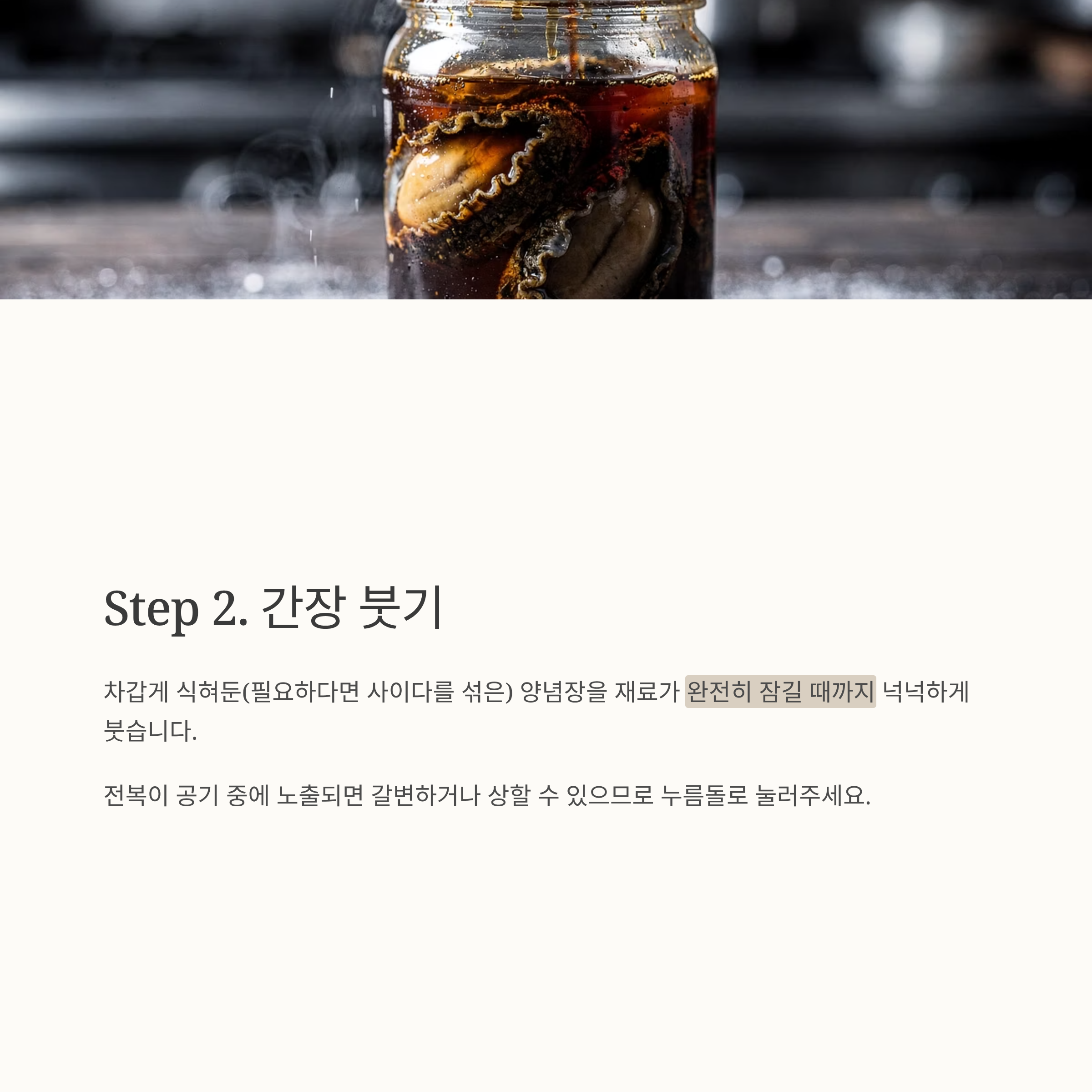 - 장기 보관 팁: 전복과 간장을 분리하여 전복은 한 번 먹을 분량씩 소분해 냉동 보관하고, 간장은 냉장 보관하세요. 드시기 전날 냉장실에서 해동하여 간장에 다시 담가두면 처음 맛 그대로 즐길 수 있습니다.