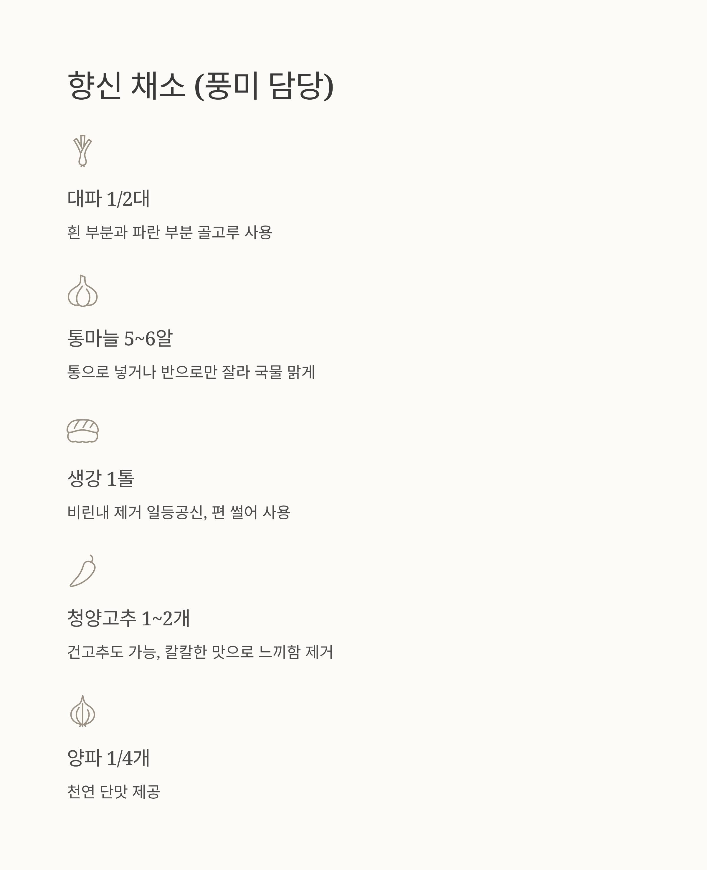 - 통마늘: 5~6알 (편 썰지 않고 통으로 넣거나 반으로만 잘라 넣어야 국물이 탁해지지 않습니다.)