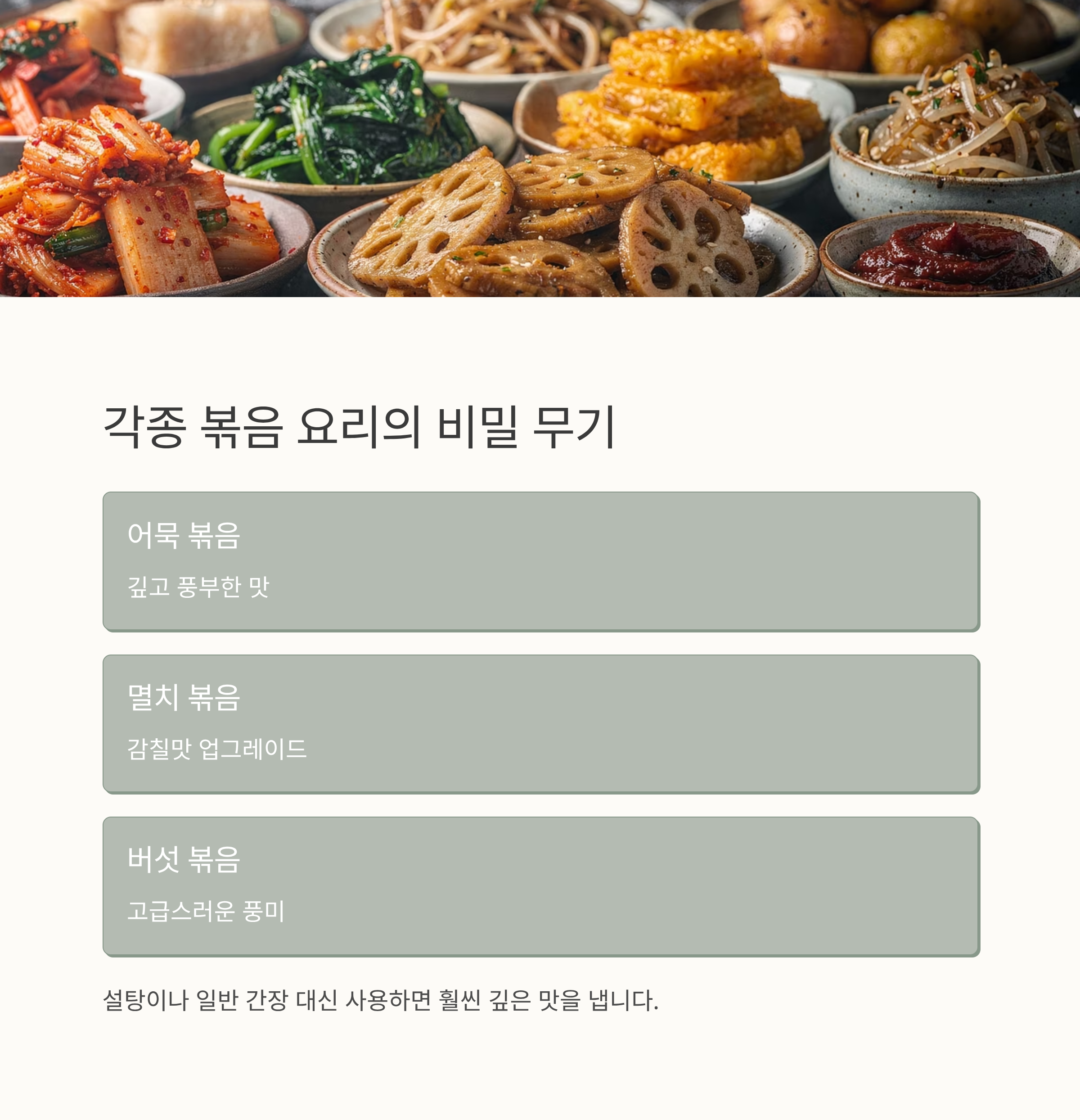 - 각종 볶음 요리: 어묵 볶음, 멸치 볶음, 버섯 볶음 등을 할 때 설탕이나 일반 간장 대신 사용하면 훨씬 깊고 풍부한 맛을 냅니다.