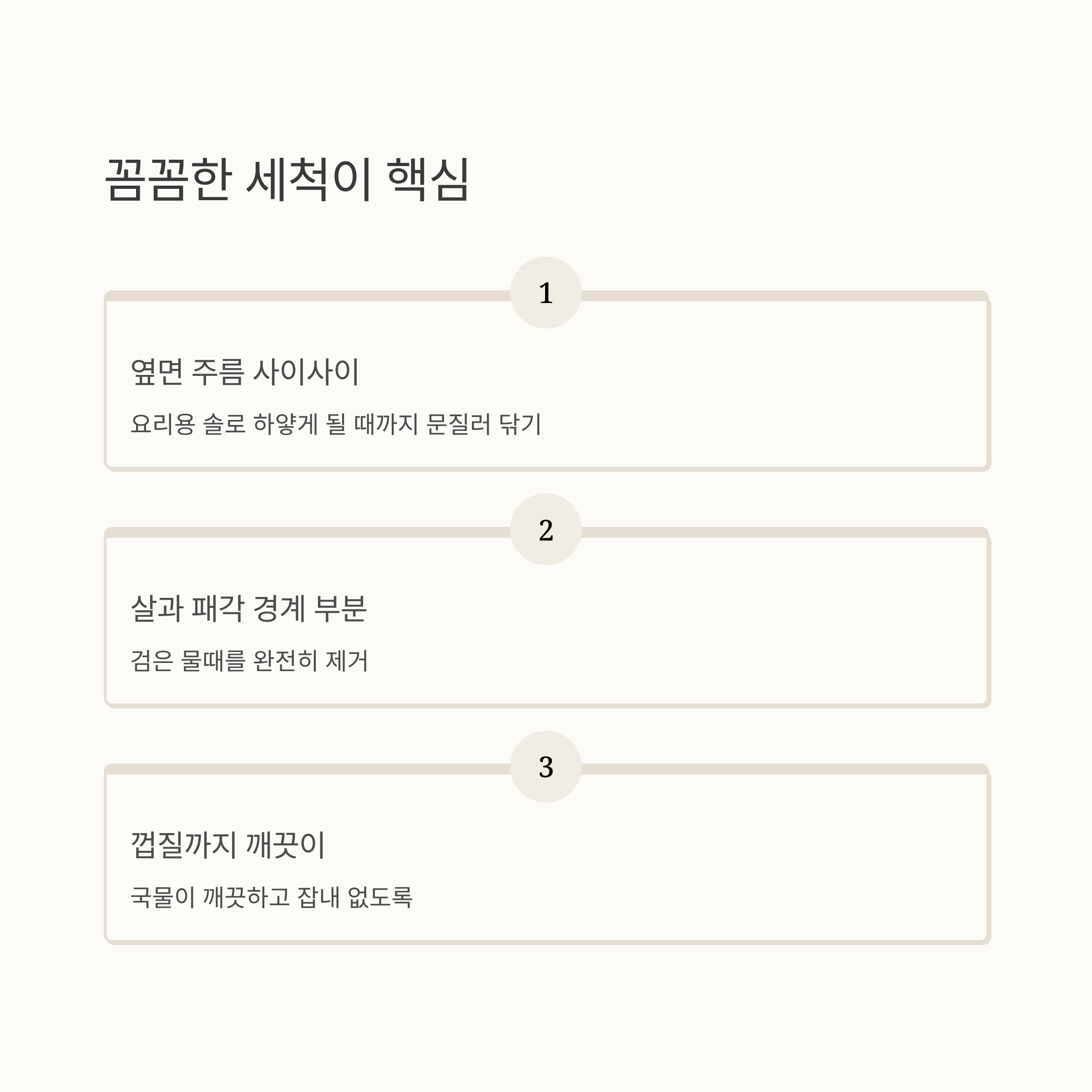 - 전복의 빨판(바닥면)만 닦는 경우가 많은데, 비린내의 주범은 빨판이 아니라 '옆면 주름'과 '껍질'입니다.