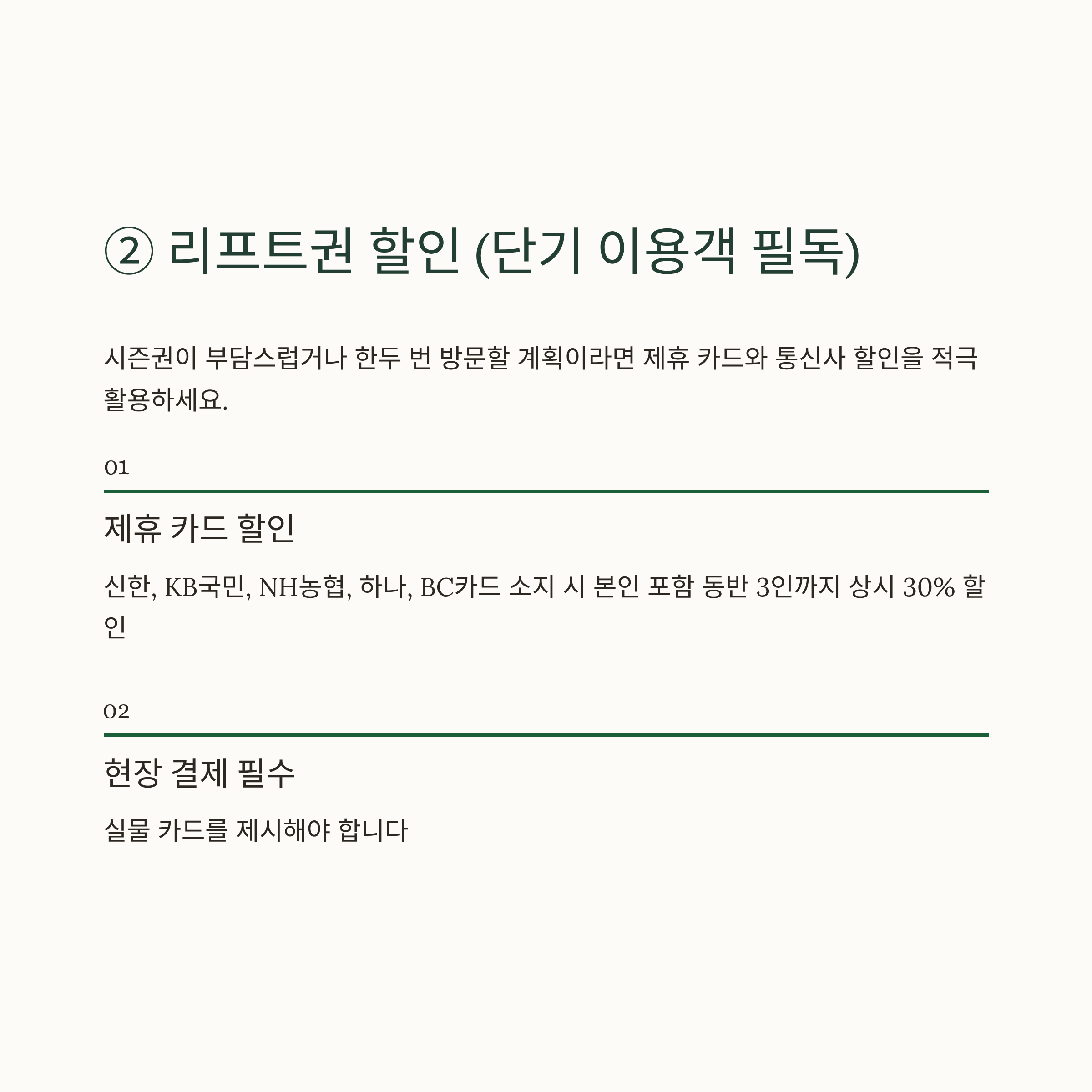 - 제휴 카드 할인 (30~50%): 신한, KB국민, NH농협, 하나, BC카드 소지 시 본인 포함 동반 3인까지 상시 30% 할인됩니다. 현장 결제 시 실물 카드를 제시해야 합니다.