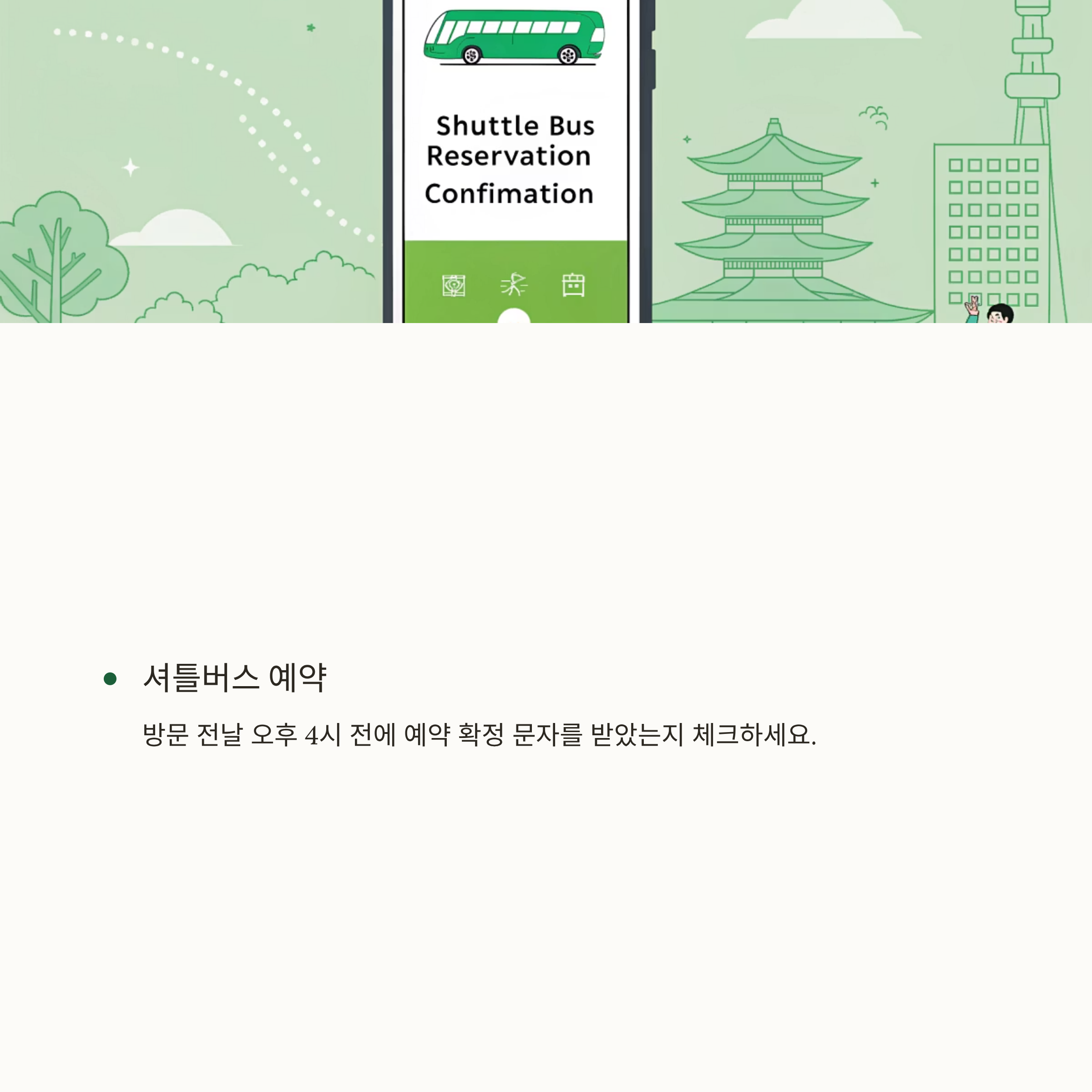 - 셔틀버스 예약: 방문 전날 오후 4시 전에 예약 확정 문자를 받았는지 체크하세요.