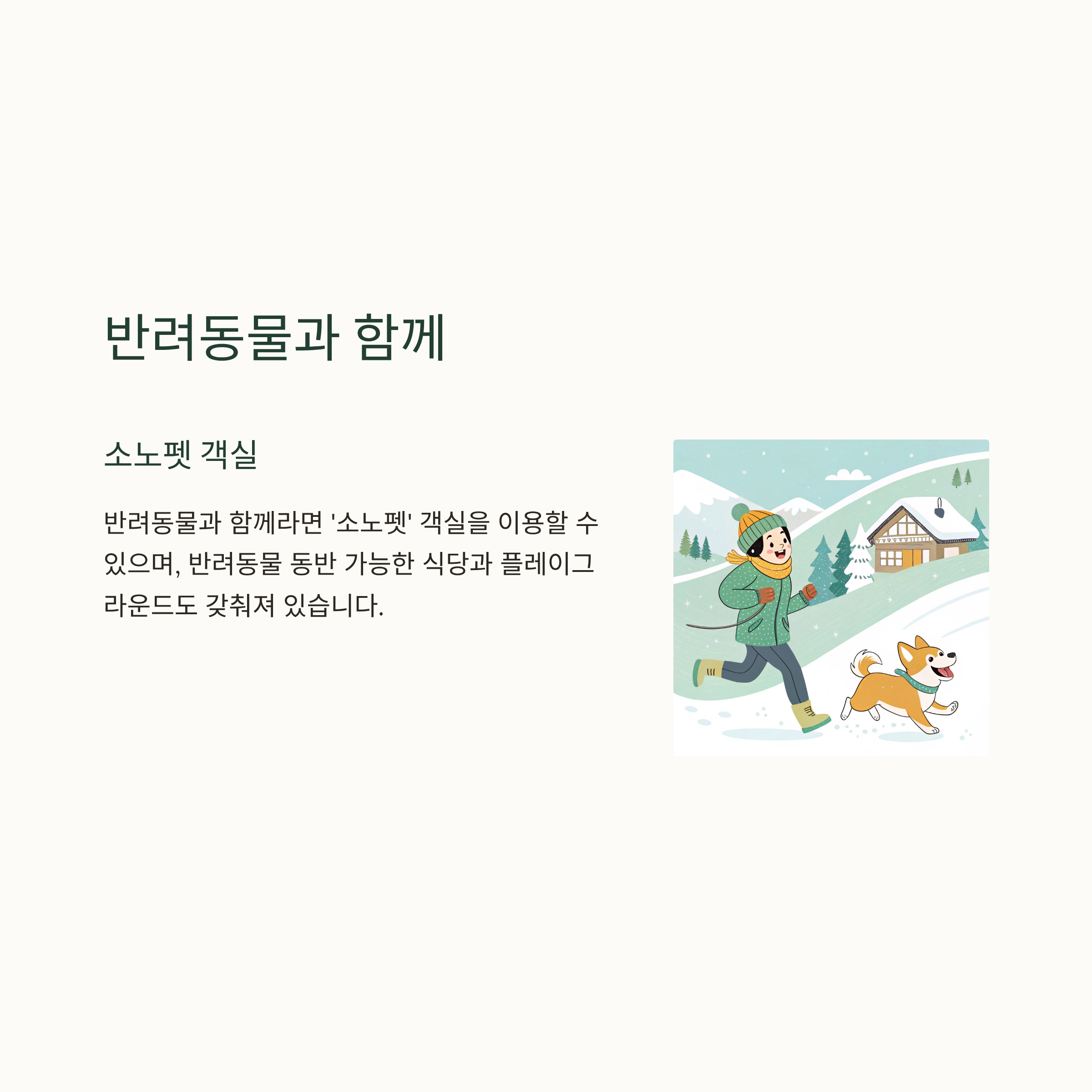 - 소노펫: 반려동물과 함께라면 '소노펫' 객실을 이용할 수 있으며, 반려동물 동반 가능한 식당과 플레이그라운드도 갖춰져 있습니다.