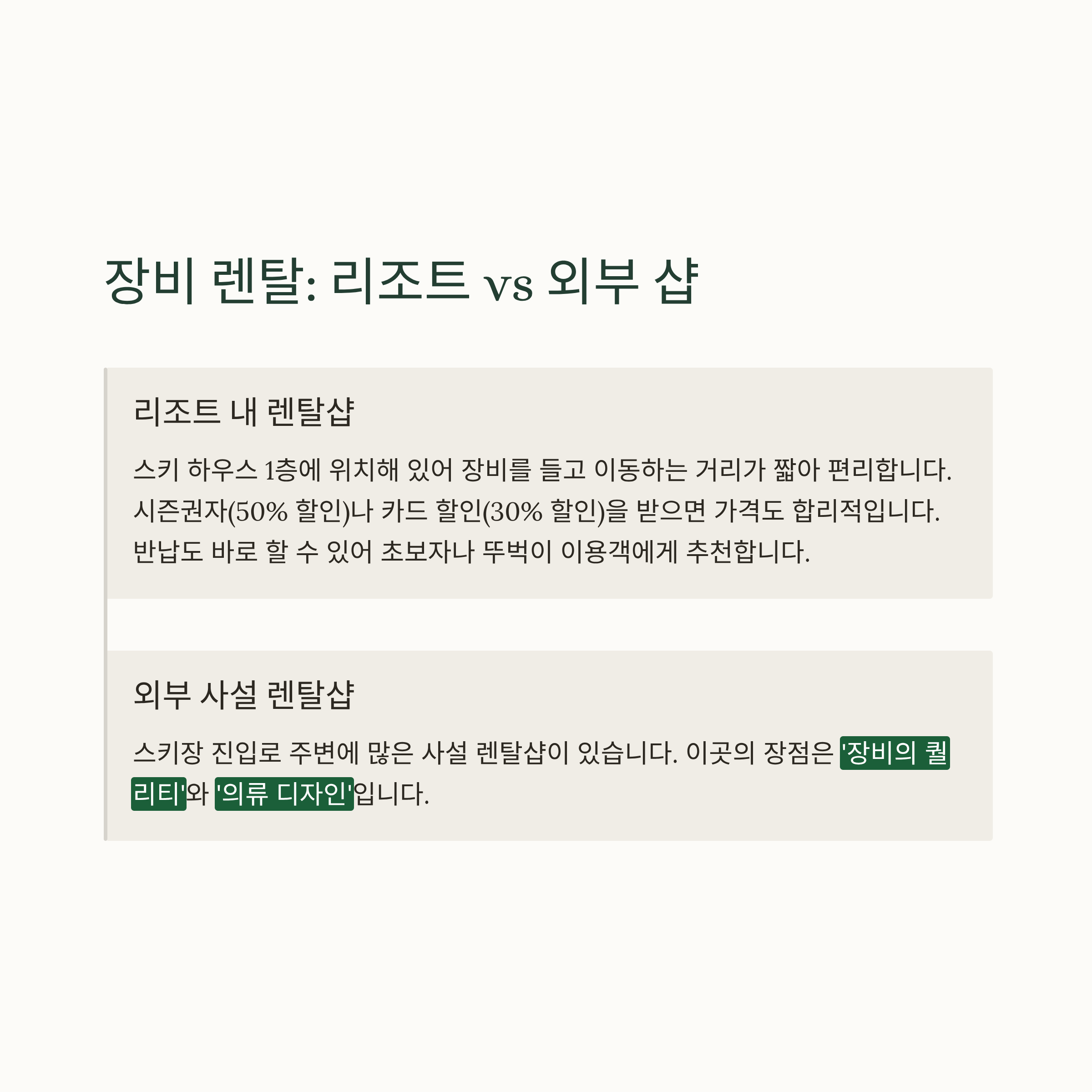 - 외부 사설 렌탈샵: 스키장 진입로 주변에 많은 사설 렌탈샵이 있습니다. 이곳의 장점은 '장비의 퀄리티'와 '의류 디자인'입니다. 최신 유행하는 핏의 스키복과 관리가 잘 된 카빙 스키, 해머데크 등을 빌릴 수 있습니다. 대부분 샵에서 리프트권 할인도 함께 제공하며, 샵에서 스키장까지 무료 픽업 서비스를 제공하므로 자차가 없어도 이용 가능합니다.
