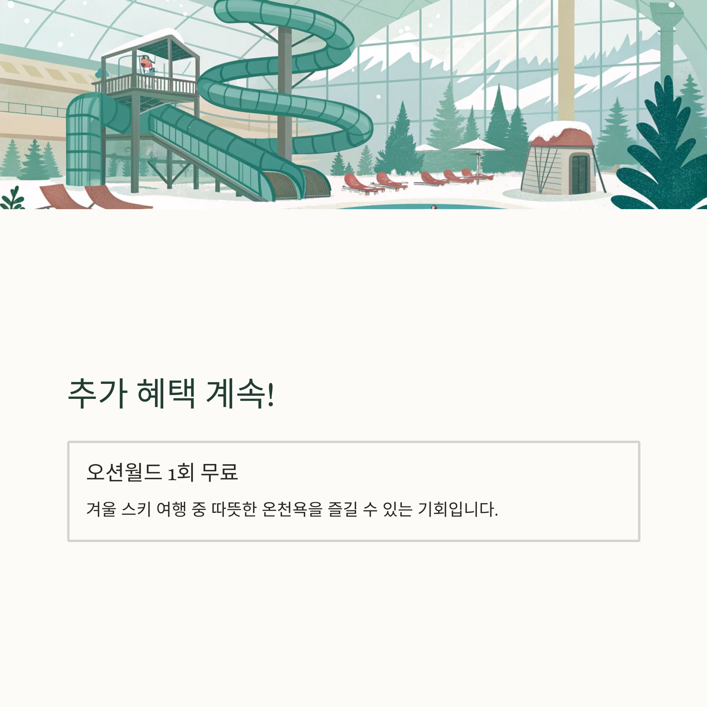 - 오션월드 1회 무료: 겨울 스키 여행 중 따뜻한 온천욕을 즐길 수 있는 기회입니다.