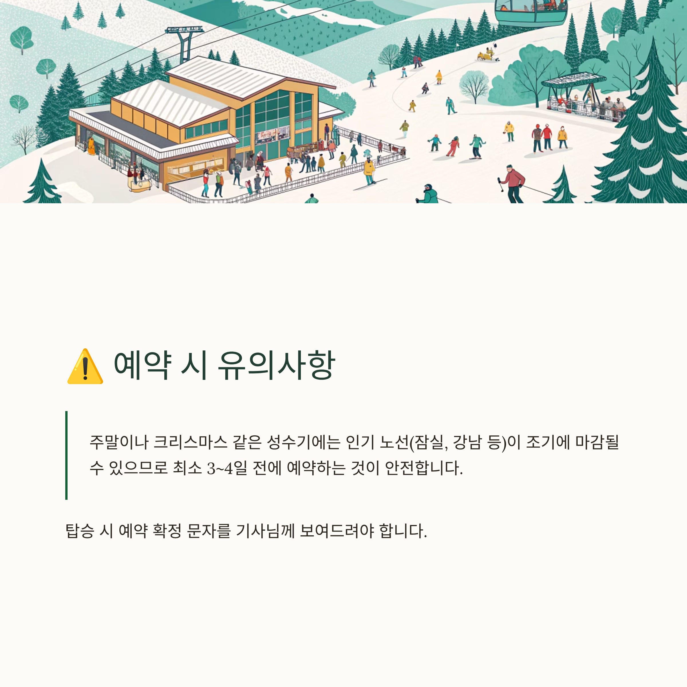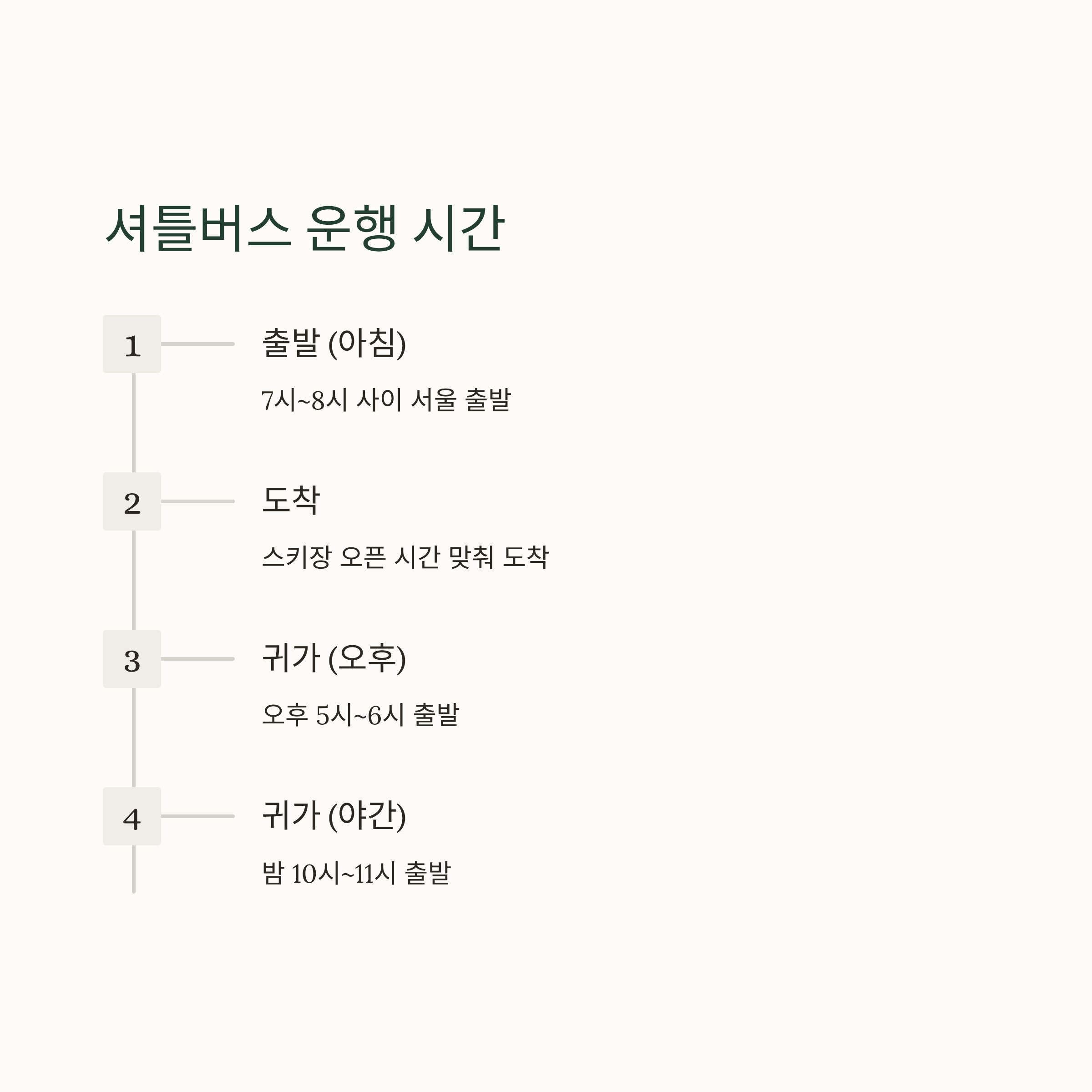 - 운행 시간: 보통 아침 7시~8시 사이에 서울에서 출발하여 스키장 오픈 시간에 맞춰 도착하며, 귀가행 버스는 오후 5시~6시, 야간 스키 종료 후인 밤 10시~11시에 출발합니다.