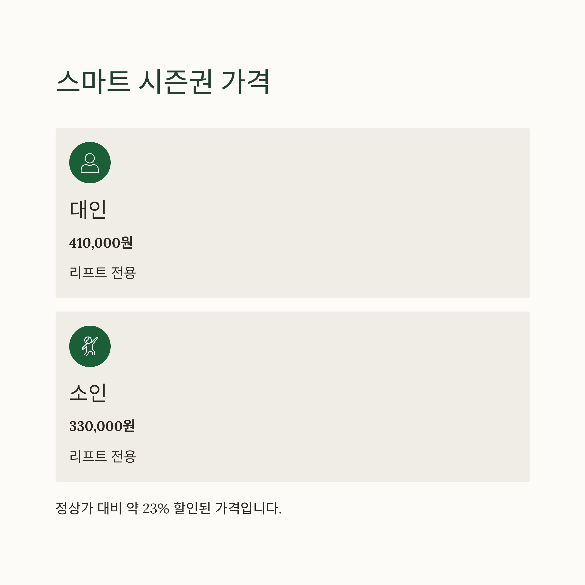 - 스마트 (리프트 전용): 대인 410,000원 / 소인 330,000원 (정상가 대비 약 23% 할인)