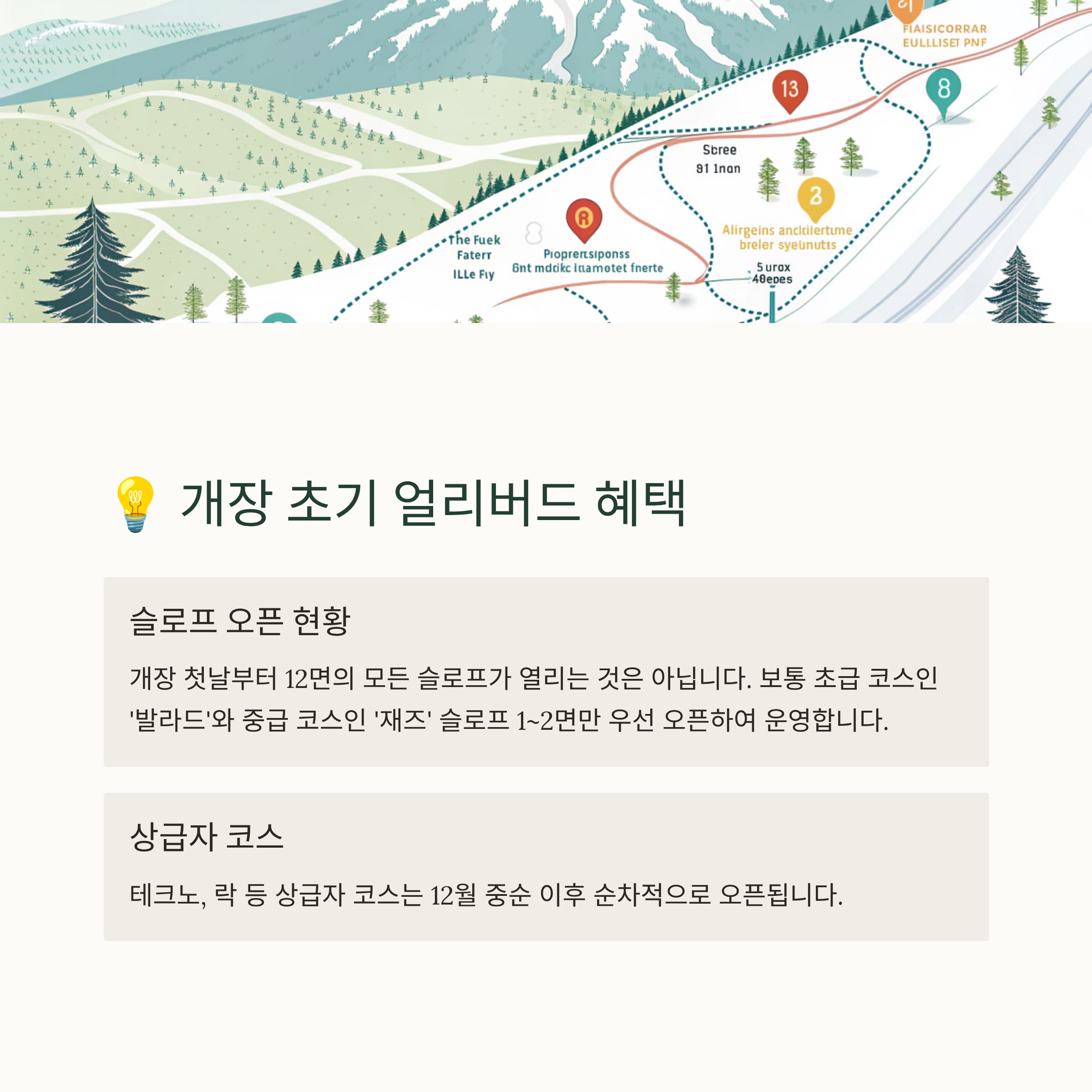 - 슬로프 오픈 현황: 개장 첫날부터 12면의 모든 슬로프가 열리는 것은 아닙니다. 보통 초급 코스인 '발라드'와 중급 코스인 '재즈' 슬로프 1~2면만 우선 오픈하여 운영합니다. 상급자 코스(테크노, 락 등)는 12월 중순 이후 순차적으로 오픈됩니다.