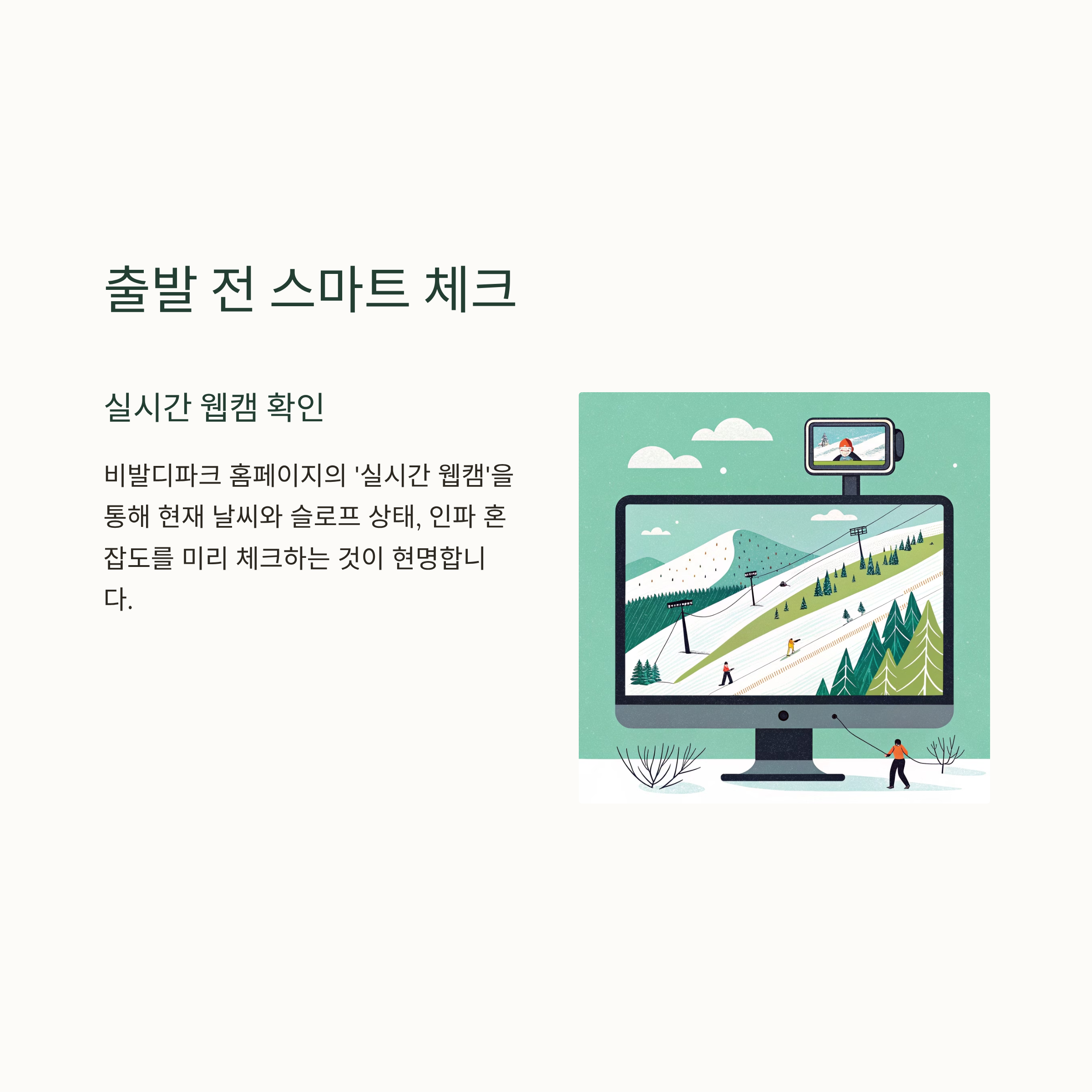 - 웹캠 확인: 출발 전 비발디파크 홈페이지의 '실시간 웹캠'을 통해 현재 날씨와 슬로프 상태, 인파 혼잡도를 미리 체크하는 것이 현명합니다.