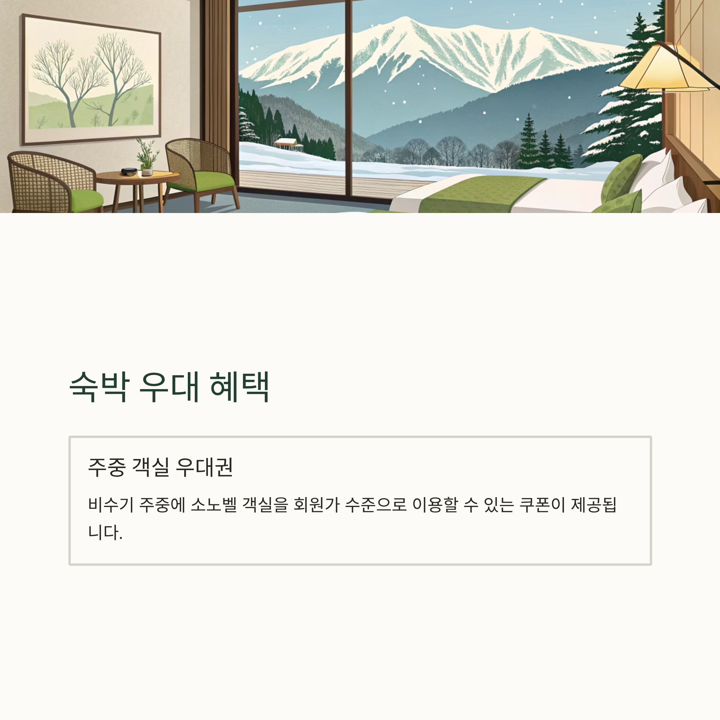 - 주중 객실 우대권: 비수기 주중에 소노벨 객실을 회원가 수준으로 이용할 수 있는 쿠폰이 제공됩니다.