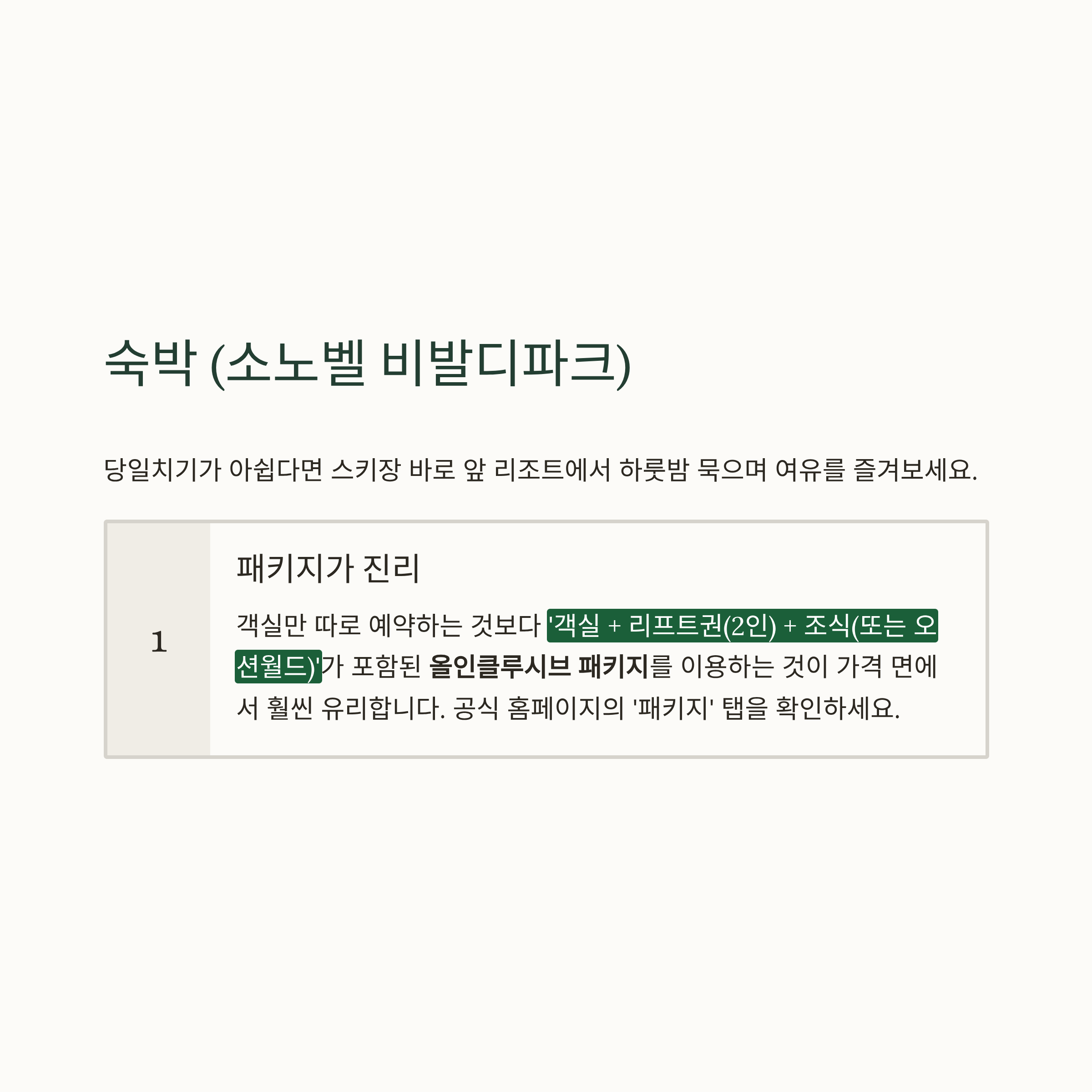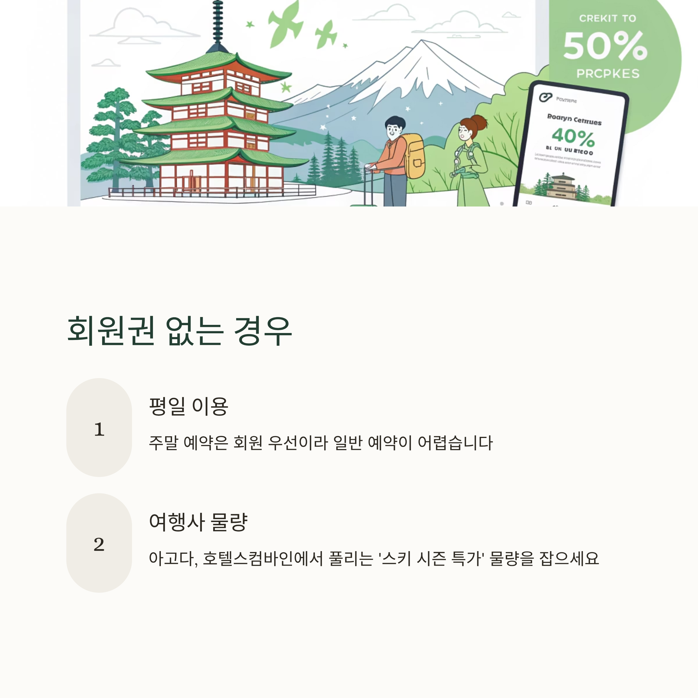 - 회원권 없는 경우: 주말 예약은 회원 우선이라 일반 예약이 어렵습니다. 평일 이용을 노리거나, 여행사나 숙박 앱(아고다, 호텔스컴바인)에서 풀리는 '스키 시즌 특가' 물량을 잡으세요.