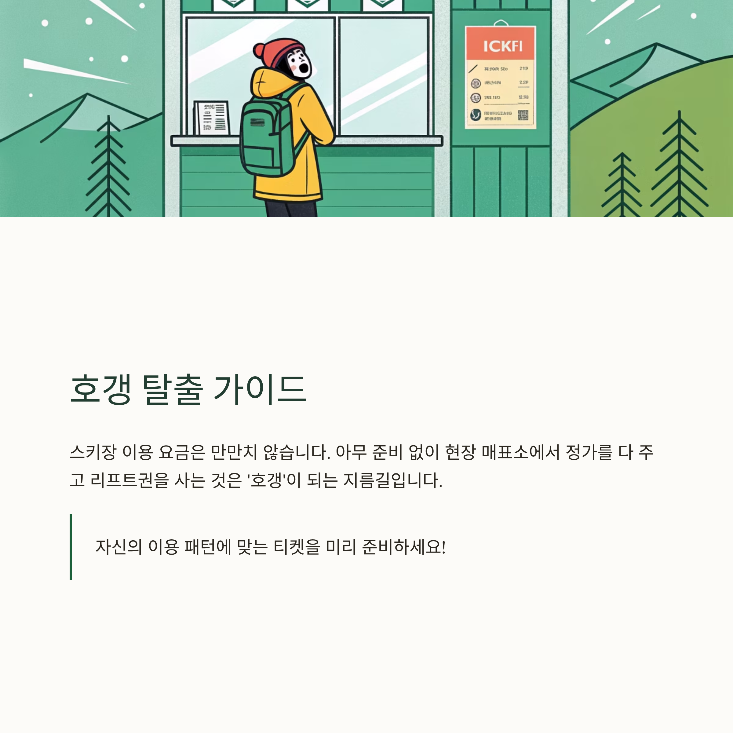 스키장 이용 요금은 만만치 않습니다. 아무 준비 없이 현장 매표소에서 정가를 다 주고 리프트권을 사는 것은 '호갱'이 되는 지름길입니다. 자신의 이용 패턴에 맞는 티켓을 미리 준비하세요.
