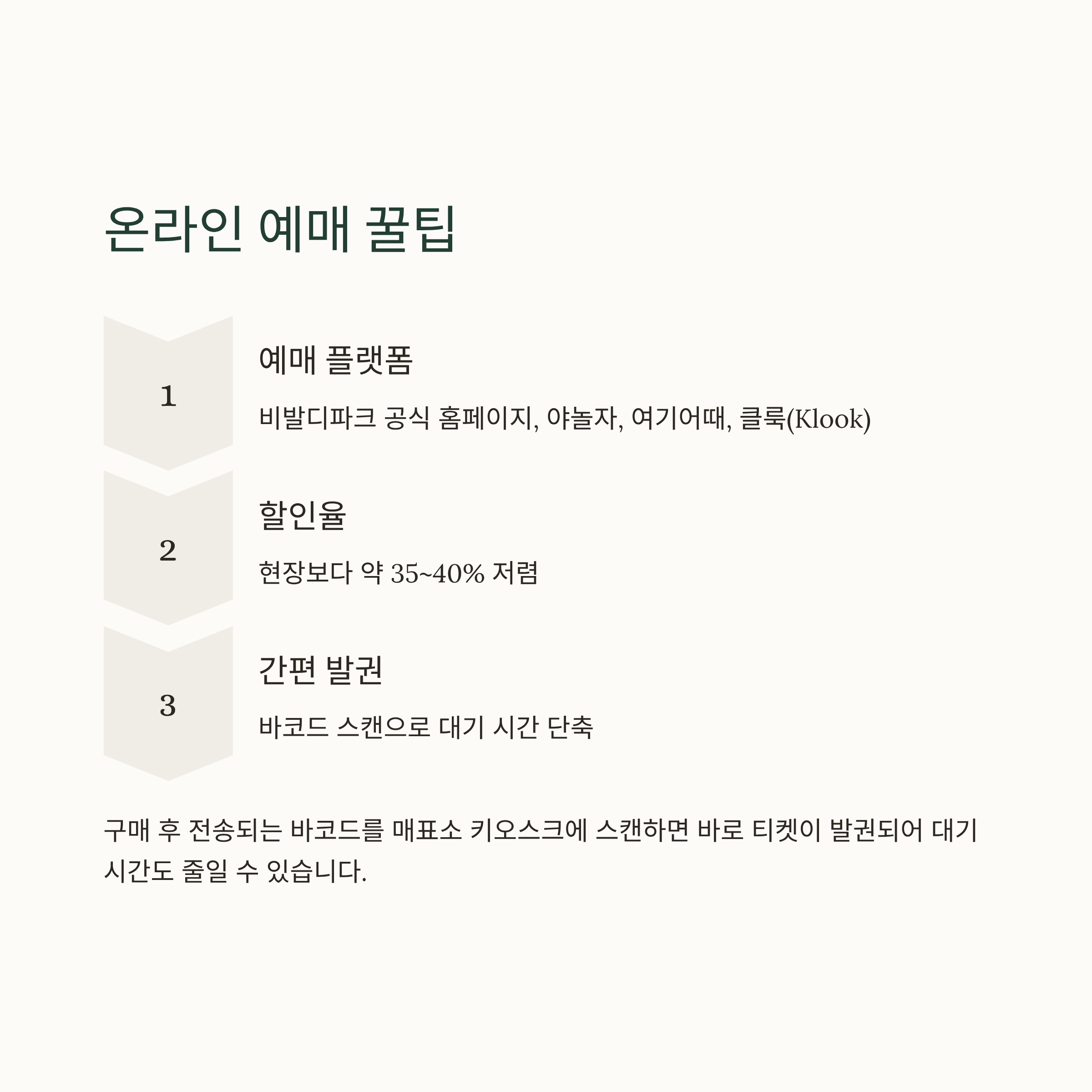 시즌권이 부담스럽거나 한두 번 방문할 계획이라면 제휴 카드와 통신사 할인을 적극 활용하세요.